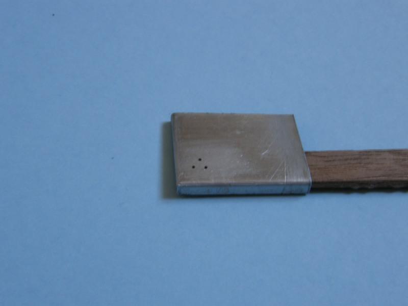 Wywiercamy w kawałku drewna 3 otwory o średnicy grubości szpilki (0,6 mm), które posłużą za wzorzec otworów w jufersie (dlatego trzeba to zrobić precyzyjnie i w razie potrzeby - powtórzyć).