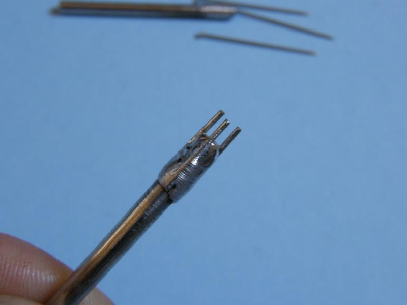 W tak wywiercone otwory wkładamy kawałki szpilki i lutujemy. I dokładniej to zrobimy tym równiej rozstawione otwory w jufersie będą wychodzić. (na fotce uchwyt tokarski złożony "na sucho". zarówno szpilki, jak i końcówkę frezu należy pokryć kalafonią i cyną, aby łatwiej się lutowało w całość).