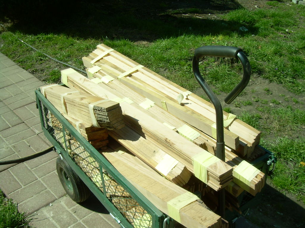 Jak możecie zobaczyć na wózku suszę/sezonuję drewno już pocięte na listwy w pakietach ciasno sklejonych taśmą malarską. W ten sposób przechowywane listwy nie paczą się.