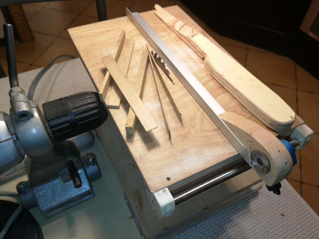 Mini pilarka, którą zrobiłem jak widzę dwa lata temu ma się świetnie. Rozcinam na niej głównie listewki na poszywanie kadłuba, pokłady itp. Natomiast do detali wielkości zapałek i bardzo precyzyjnych cięć jest jeszcze za duża (85mm tarcza i obroty z wiertarki max3 tys co nie dają 100% dokładności i komfortu przy cięciu)