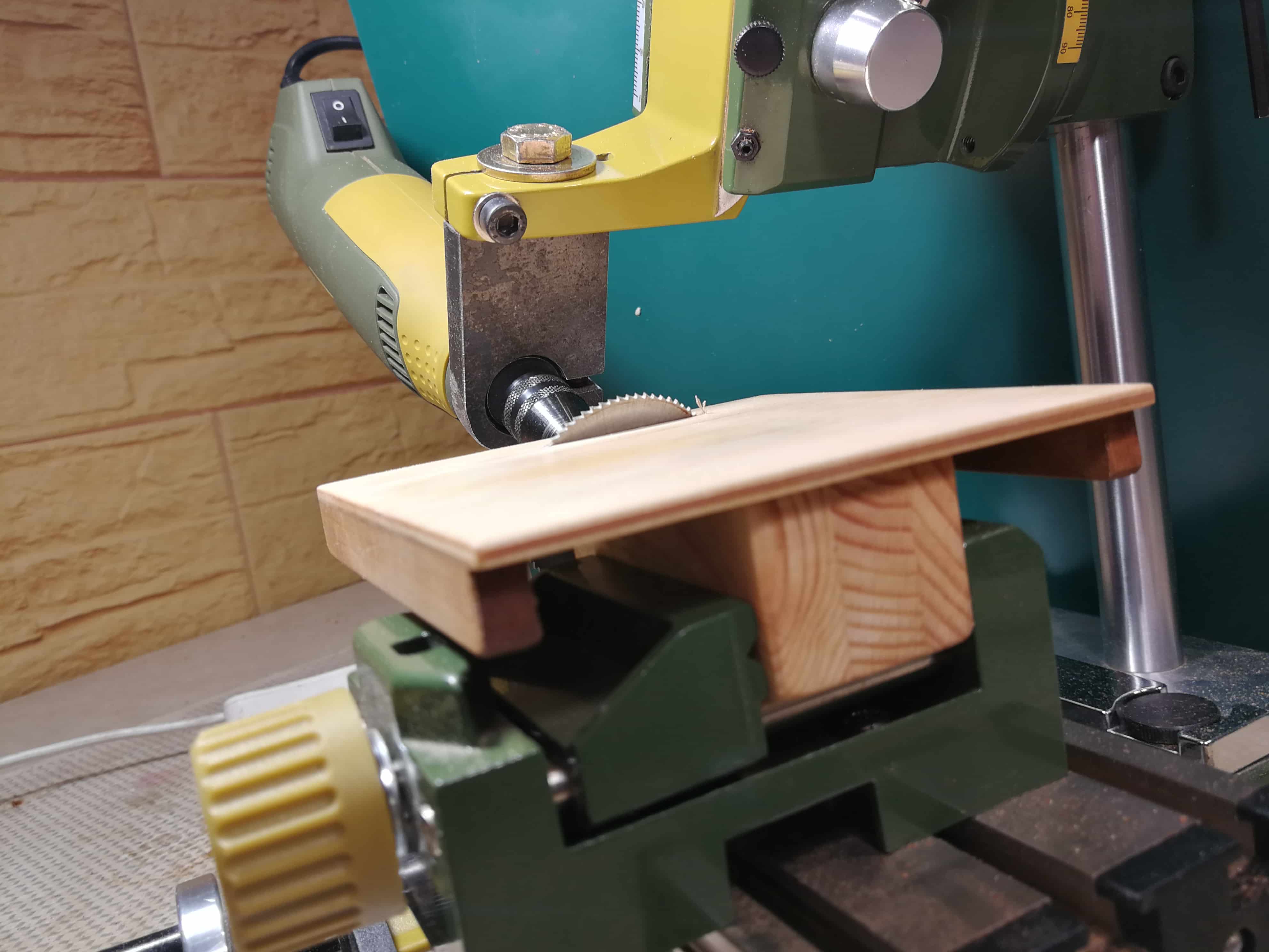 Wkręciłem się w kombinowanie przy mojej nowej mini pilarce i wykorzystując zrobiony już stolik i prowadnice zrobiłem niezależną wersję. Na desce zamocowałem imadło ( można oczywiście zamocować stolik na stałe lub śruby) ale zależało mi na szybkim przełożeniu stolika do stojaka proxxona. Ta wersja nie ma niestety regulacji pod kątem i płynnego ustawiania wynurzenia tarczy, ale za to nie muszę przezbrajać za każdym razem stojaka. Z racji że mam dwie szt szlifierek, pilarka do podstawowych cięć jest zawsze pod ręką. Udoskonaliłem prowadnicę poprzeczną, zrobiona jest z pręta stalowego kwadrat 7x7. Przy zrobieniu wycięcia widać jak sprawdza się przydaśka do mocowania szlifierki - zdecydowanie zwiększa zakres regulacji w różnych pozycjach.