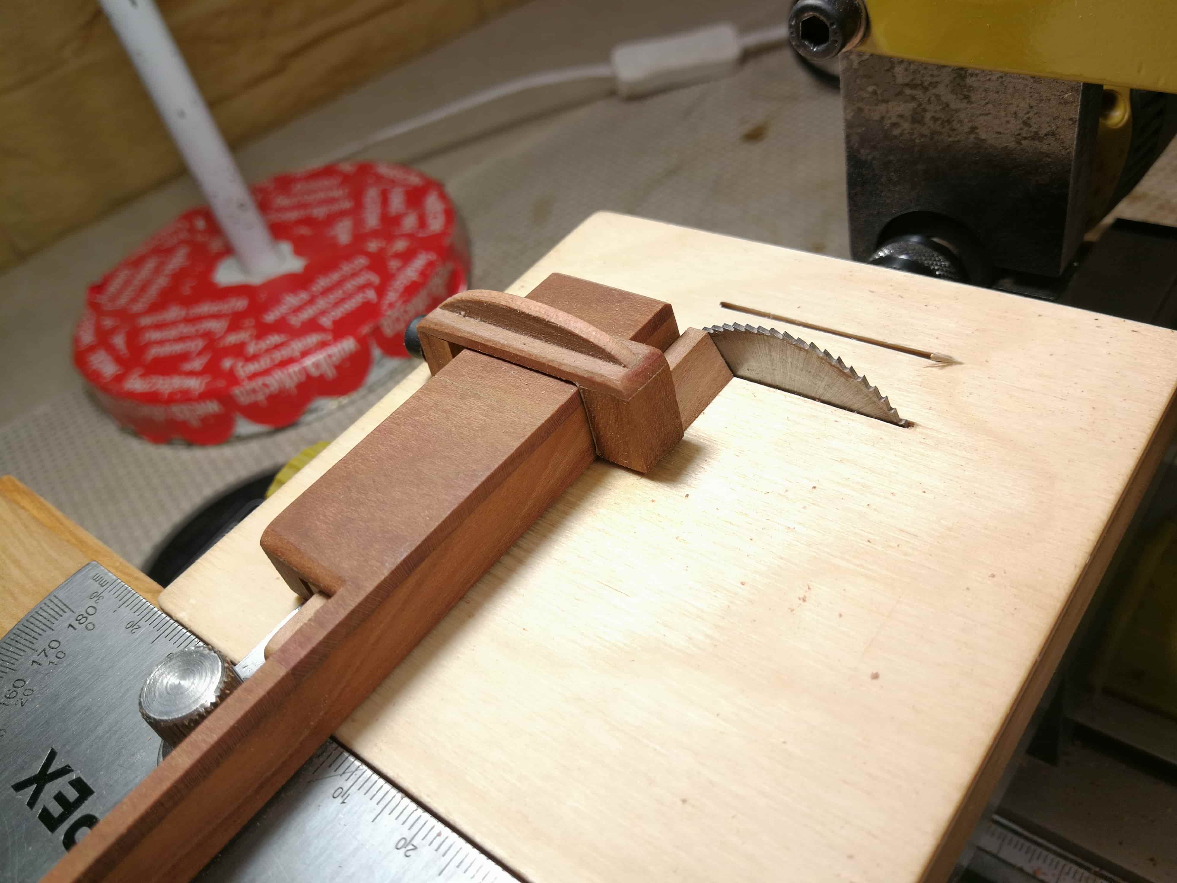 Stolik ze sklejki 3mm 10x10cm wzmocniony na krawędziach listewkami i banalnie proste zamocowanie w imadełku. Prowadnicę wzdłużną bardzo łatwo i precyzyjnie ustawia się na wymiar dzięki jej prostopadłości do stolika i długim prowadnicom po obu stronach. Wykonane są z drewna jabłoni w którym dało się bez problemu wykonać gwinty M4 do zaciskania prowadnicy.
