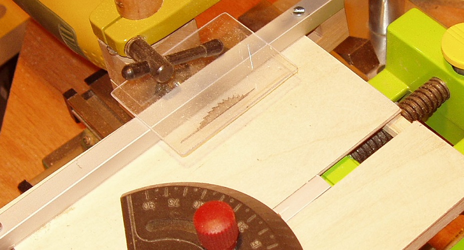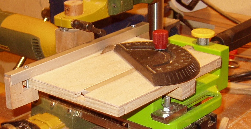 Po przeszlifowaniu sklejki celem usunięcia ewentualnego filmu zabezpieczającego skleiłem w "prasie" (imadle) dwie warstwy uzyskując sklejkę 6-warstwową. Sklejkę wzmocniłem listewkami jesionowymi 8x8 mm. Przydaśkę zrobiłem z gruszy. Trzpień udało się wytoczyć na średnicę 19,98 mm i trzyma się w zacisku jak metalowy. Na prowadnicę ( odbojnicę) wykorzystałem kawałek profilu aluminiowego 10x10 mm. Wyszła z tego dość solidna konstrukcja a prezentuję ją na zdjęciach niestety kiepskiej jakości. Potwierdzam doświadczenia Witka - piła pięknie tnie wzdłuż i w poprzek włókien oraz umożliwia bardzo różne ustawienia.