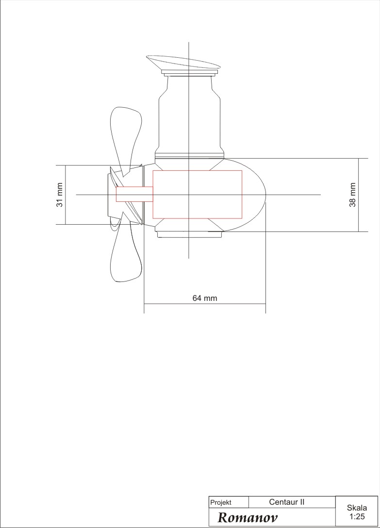 Ja osobiście zastanawiałem się nad pominięciem przekładni kątowej która powoduje spory hałas oraz spore opory, a w miejsce przekładni umieścić silnik elektryczny. Jedynym problemem jest dopasowanie wielkością silnika i jakieś przekładni. Poniżej zamieszczam rysunek z wymiarami napędu Centaura II.