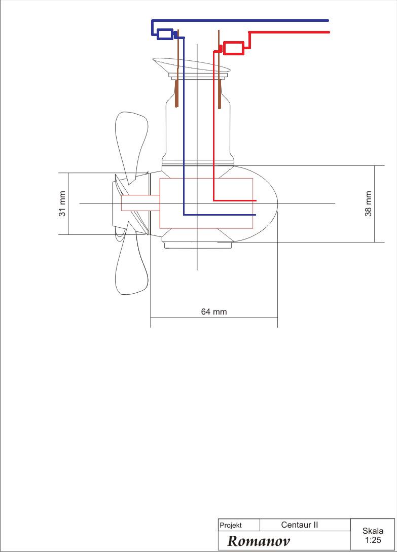 Hmmm... . Średnica śruby napędowej w tym modelu to widzę że wynosi prawie 90mm , a to już problem.Potrzeba będzie mocy aby to sprawnie pracowało,obroty jakie by były potrzebne do sprawnej pracy śruby szacuję na jakieś +-1800 Rpm .Romanow masz racje duża przekładnia zębata nie wchodzi w rachubę z powodów które podałeś. Ale zawsze można do niej wrócić..... . Tylko silnik elektryczny szczotkowy . Tak patrzę na wymiary głowicy napędowej na Twoim rysunku... tam prawie udało by się wcisnąć 480 tkę . Tylko jeszcze żeby szło tam wcisnąć jakąś małą przekładnię zębatą . Napęd bezpośredni z wału silnika - biorąc pod uwagę podana przeze mnie średnicę śruby napędowej ( chyba się nie mylę) , nie jest możliwy.Osobnym tematem była by kwestia ew. uszczelnienia tego zespołu napędowego.Chociaż na którymś z forów wyczytałem że zawodnicy wyczynowi docierali silniki szczotkowe całe zanurzone w wodzie , wszak woda też redukuje tarcie... ale przekładnia zębata to by chyba za długo nie wytrzymała.