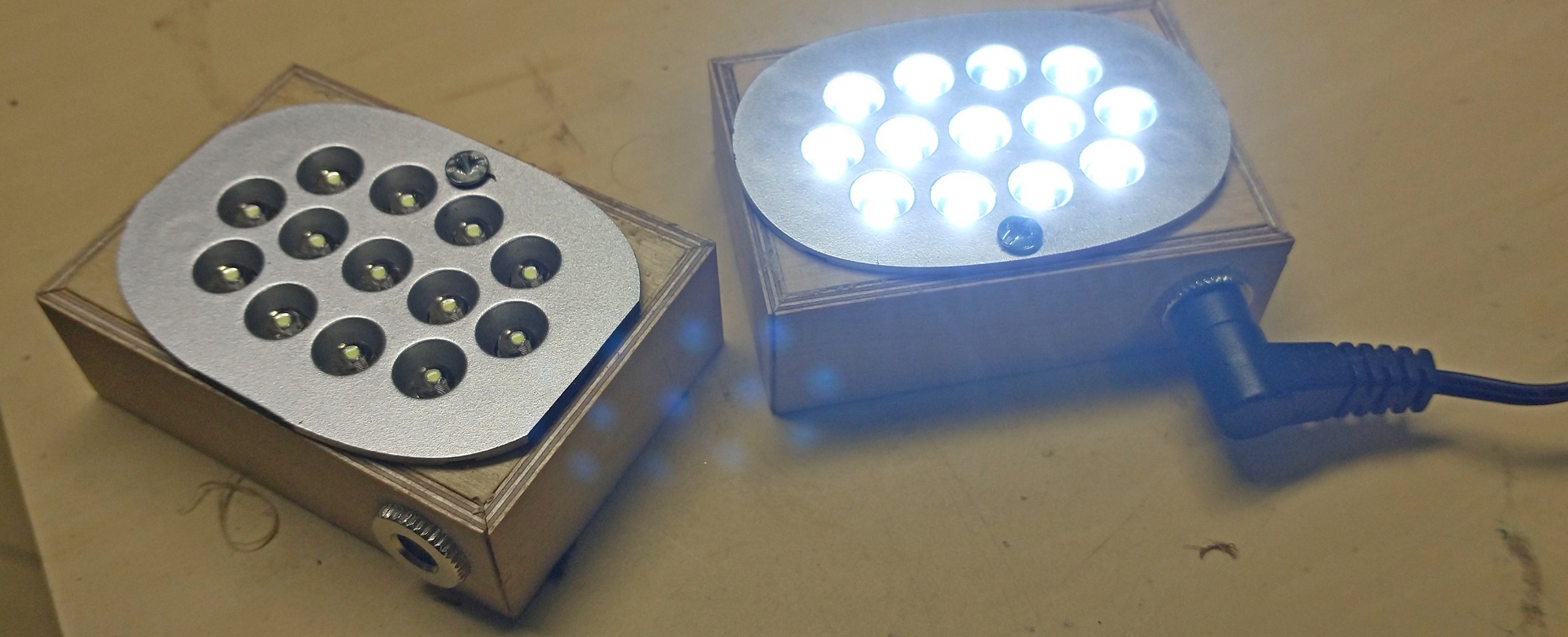 Początkowo chciałem zastosować paski LED, ale nie miałem pod ręką kawałków tych pasków (kupno 5 metrów mijało się z celem), nabyłem drogą kupna dwie takie lampki do laptopa. 10 zł sztuka: Wyjąwszy płytkę z żarówkami, sporządziłem takie pudełeczka. Wymieniłem też złącze USB, na praktyczniejsze gniazda kocentryczne:Zasilacz z jakiegoś starego urządzenia elektronicznego (6V, 2A), zapewnił energię. Świeci całkiem jasno.Na razie przykleiłem pudełka na taśmie dwustronnej, z czasem okaże się, gdzie będzie praktyczniej je zamontować na stałe. W przypadku piły taśmowej, światło padające prostopadle do błyszczącego blatu, jest niezbyt szczęśliwym pomysłem:Za to z frezarką nie ma problemu:Zważywszy, że zasilacz znalazłem na strychu, kawałki sklejki też walają się wszędzie u każdego chyba modelarza, takie oświetlenie jest całkiem tanie. Kupiłem jedynie lampkę za dychę i gniazdko do zasilania za 2,50.