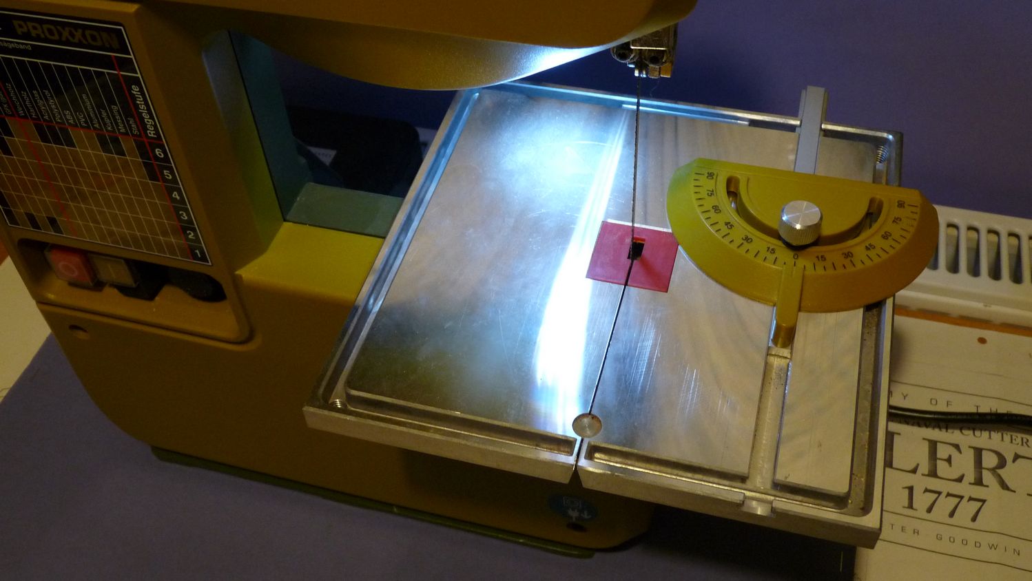 Początkowo chciałem zastosować paski LED, ale nie miałem pod ręką kawałków tych pasków (kupno 5 metrów mijało się z celem), nabyłem drogą kupna dwie takie lampki do laptopa. 10 zł sztuka: Wyjąwszy płytkę z żarówkami, sporządziłem takie pudełeczka. Wymieniłem też złącze USB, na praktyczniejsze gniazda kocentryczne:Zasilacz z jakiegoś starego urządzenia elektronicznego (6V, 2A), zapewnił energię. Świeci całkiem jasno.Na razie przykleiłem pudełka na taśmie dwustronnej, z czasem okaże się, gdzie będzie praktyczniej je zamontować na stałe. W przypadku piły taśmowej, światło padające prostopadle do błyszczącego blatu, jest niezbyt szczęśliwym pomysłem:Za to z frezarką nie ma problemu:Zważywszy, że zasilacz znalazłem na strychu, kawałki sklejki też walają się wszędzie u każdego chyba modelarza, takie oświetlenie jest całkiem tanie. Kupiłem jedynie lampkę za dychę i gniazdko do zasilania za 2,50.
