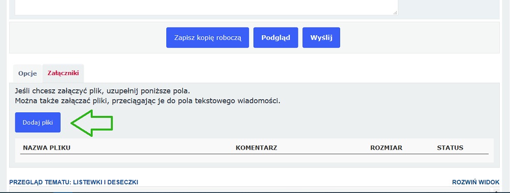 Pod edytorem, pod niebieskimi "przyciskami" m.in. Podgląd i Wyślij - szukaj Opcje i obok Załączniki
