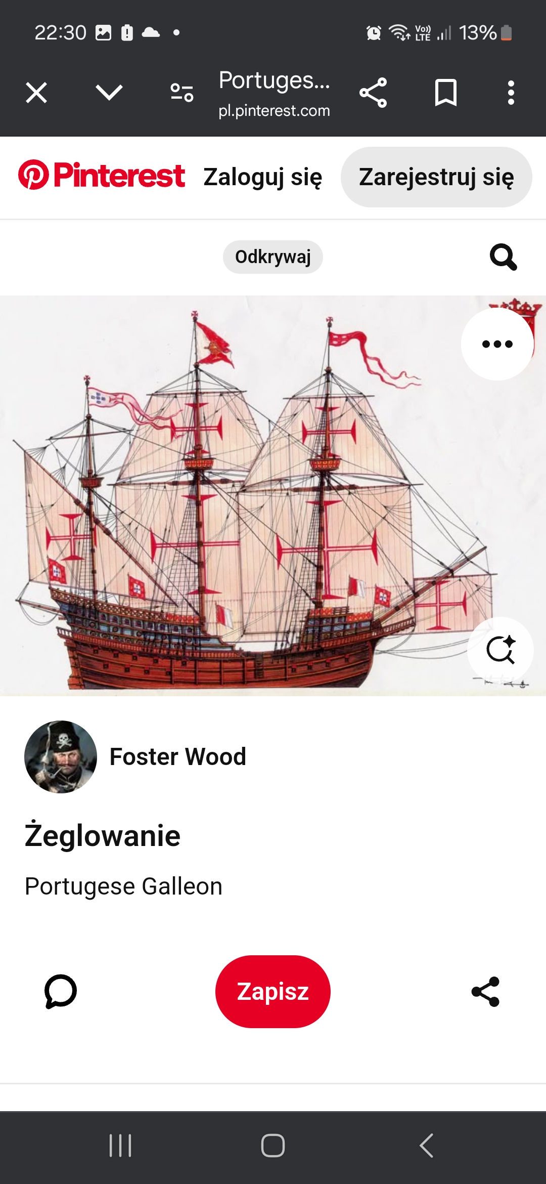 Co do krzyża na żaglach to kojarzy się z: czarnym średniowiecznym krzyżem templariuszy maltańskich. "Klasyczni" templariusze mieli czerwone krzyże z tego co pamiętam. Zakon krzyżacki to o wiele lepszy trop. Poniżej link z fotografią okrętów krzyżackich z podobnym krzyżem i foto w załączniku, https://www.polityka.pl/pomocnikhistory ... kiego.read podążając tym tropem może: https://histmag.org/Bitwa-na-Zalewie-Wi ... akow-17417 Ciekawostka, warto posłuchać: Podsumowując jeśli to nie bardzo swobodna wizja artystyczna to na podstawie krzyża na żaglach i sylwetki obstawiałbym że to statek budowany na podobieństwo do statku krzyżackiego, gdyż galeon hiszpański lub templariuszy raczej miałby czerwony krzyż o nieco innym kształcie. Dobrej nocy