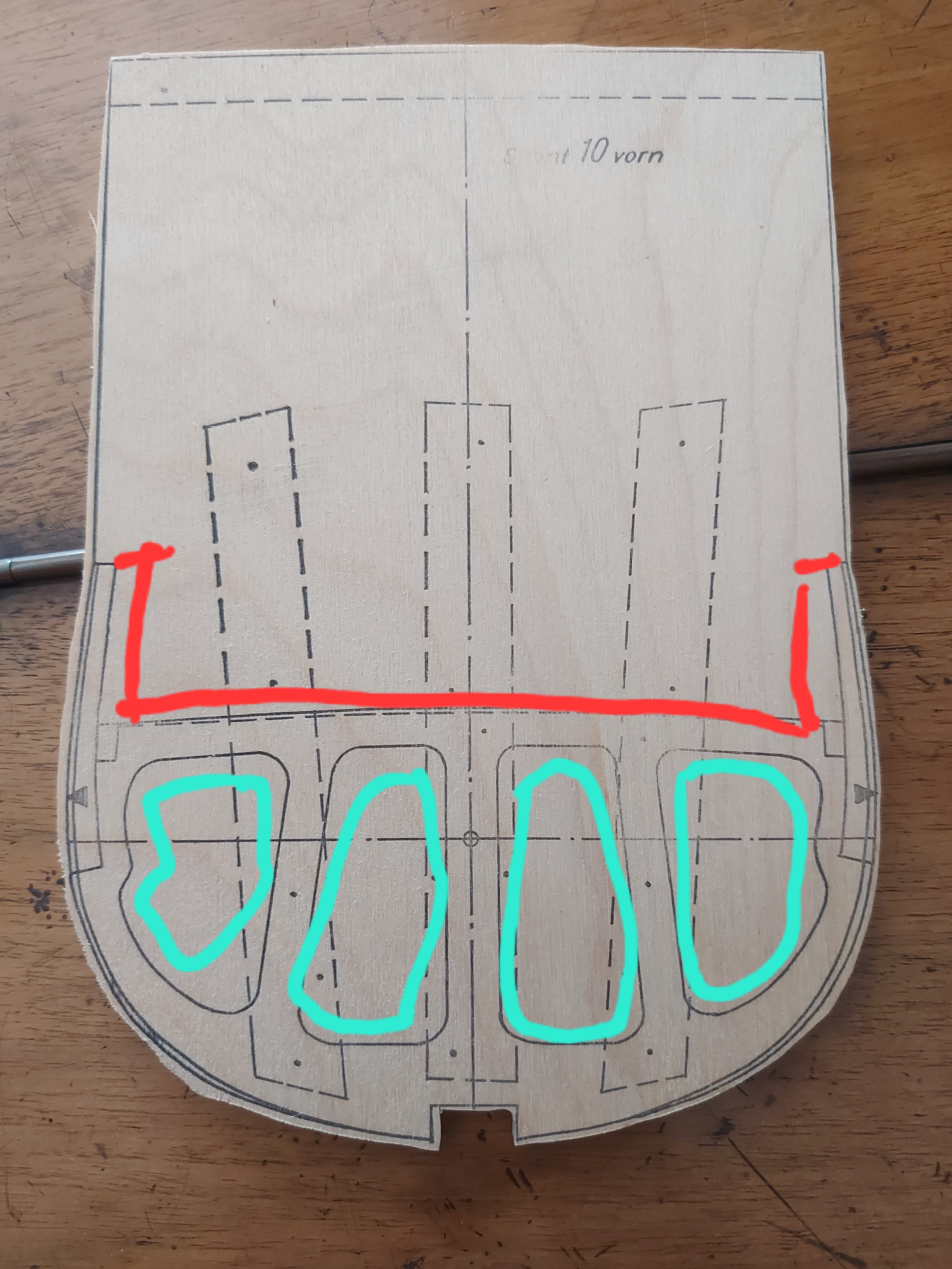 Czyli jak dobrze to zrozumiałem to najpierw trzeba go uwolnić z tych rzeczy które są zaznaczone na zielono. Potem to wszystko ogarnąć do góry nogami, przykleić poszycie. A następnie odcinać wszystko po kolei aż do tej czerwonej kreski?