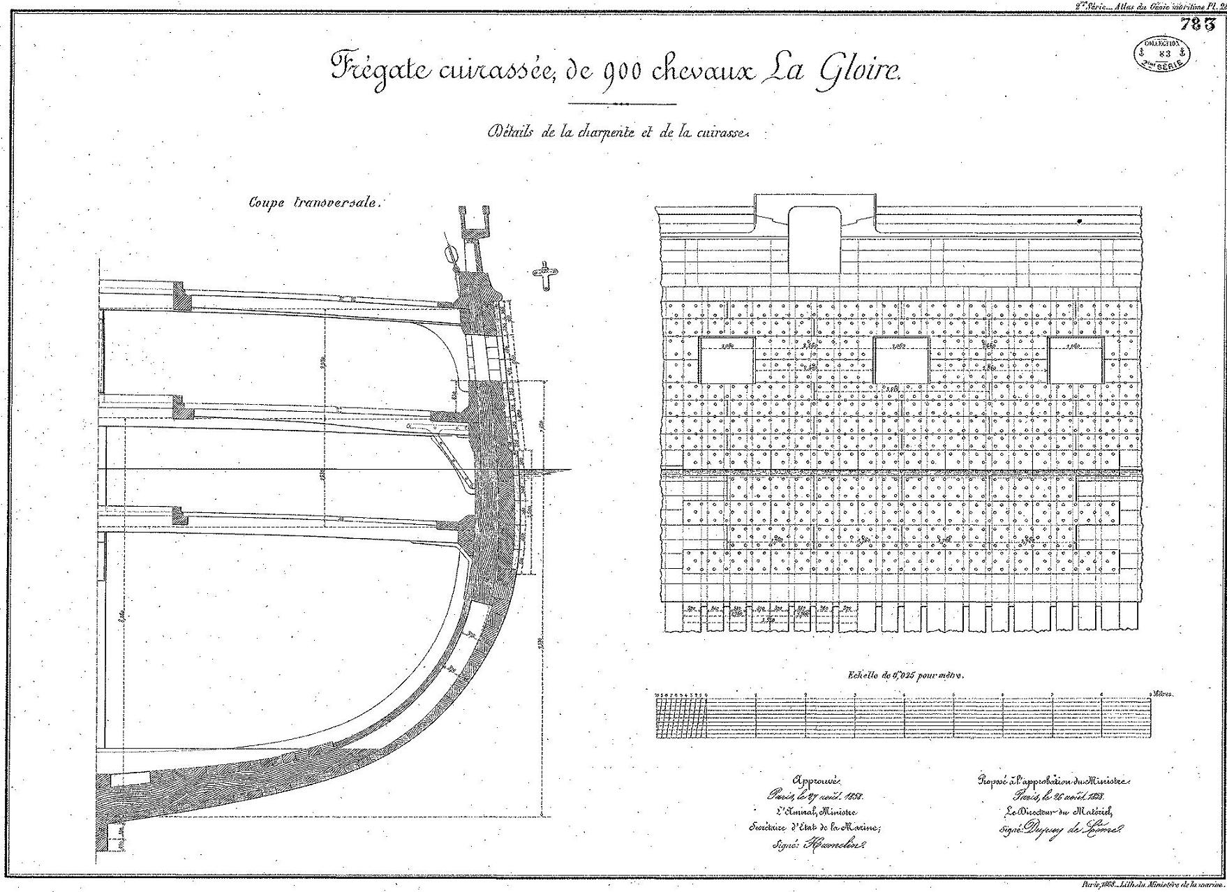 Konstrukcja francuskiej fregaty z 1858 roku.