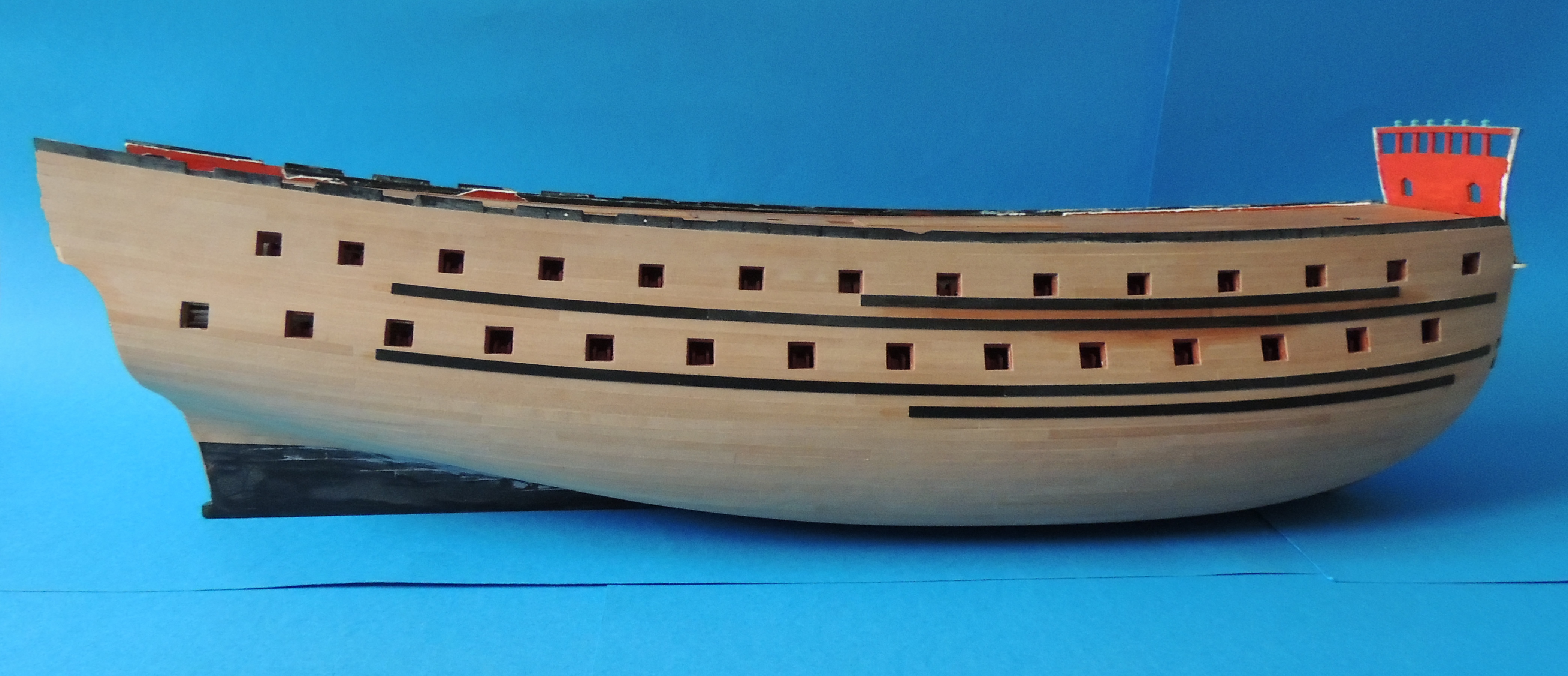 Twój post przypomniał mi, że od kilku lat kurzy mi się kadłub modelu Le Soleil Royal Hellera. Kadłub oszlifowany na gładko i oklejany fornirem. Poniżej zdjęcie jak to wygląda: