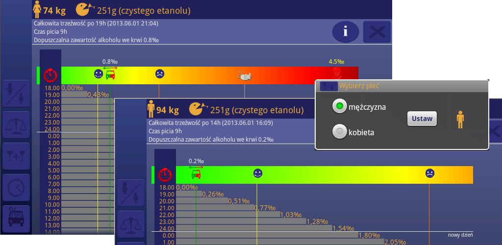 Swego czasu Radek mi radził aby się zabrać za androida. Wziąłem się. Muszę się pochwalić;) Skończyłem moją trzecią aplikację na smartfona i tablet z androidem. Sytuacja w szkołach po reformie nie jest za dobra w przedmiotach ścisłych, wiec na przekór temu aby nie popaść w "abstynencką depresję" w ramach doskonalenia umiejętności własnych napisałem sobie i nie tylko sobie;) alkomacik. Działa pod androidem na urządzeniach z ekranem dotykowym. Przynajmniej teraz człowiek wie ile ma spożyć:) Aplikacja dostępna jest pod tym adresem