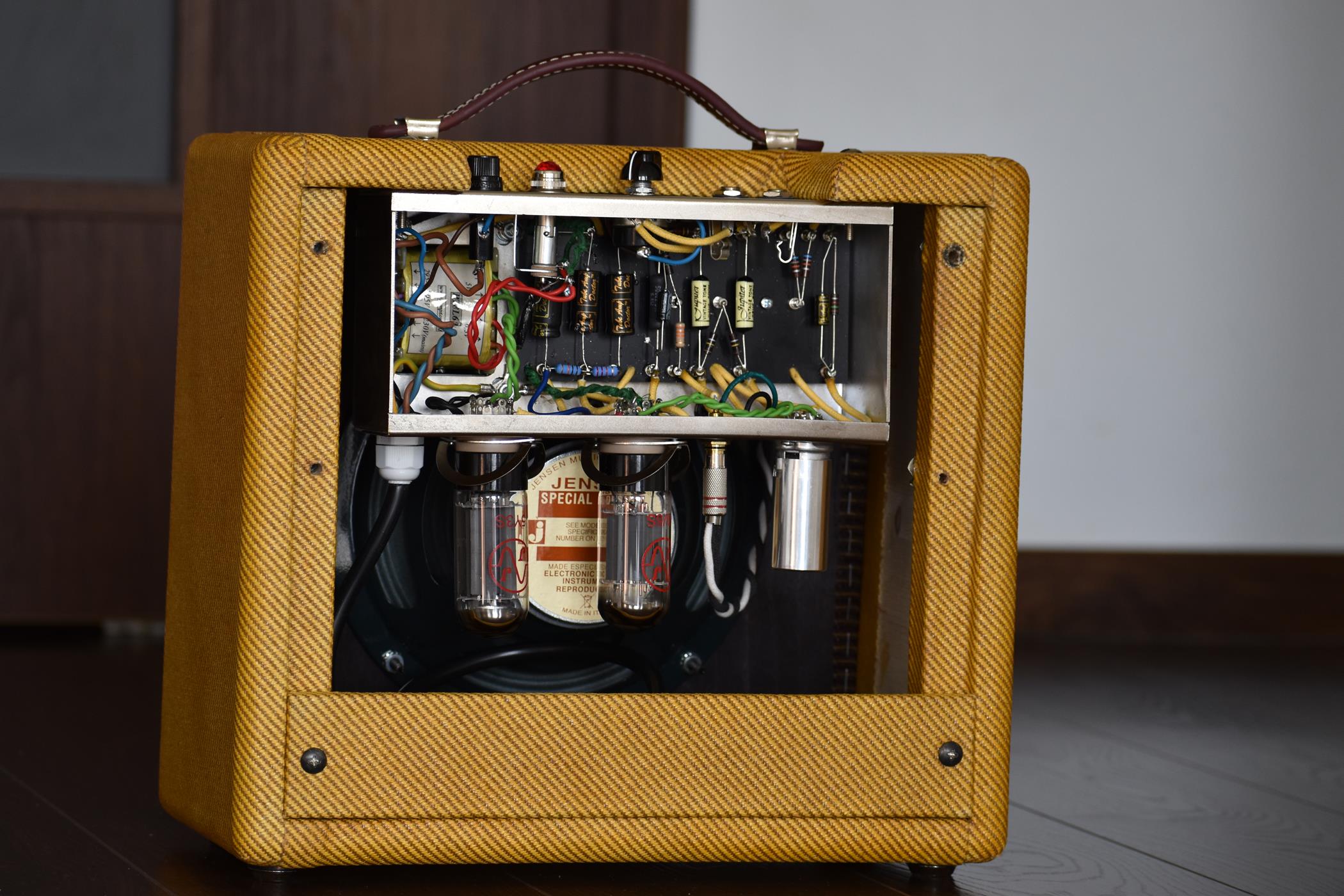 Konstrukcja lampowa 5W, jeden kanał - klon Fendera z lat 50-tych, wykonany taką samą metodą, bez płytek drukowanych.