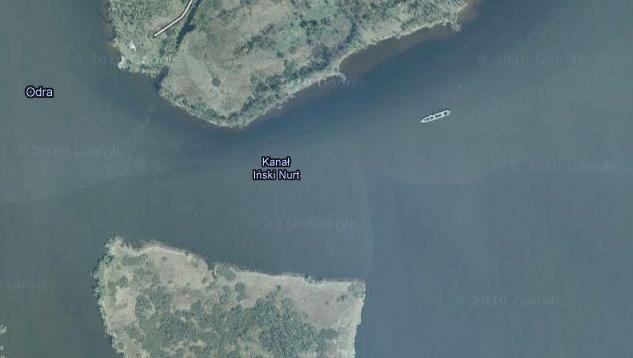 Oto częściowo zatopiony betonowiec na jeziorze Dąbie widziany z satelity (Google).