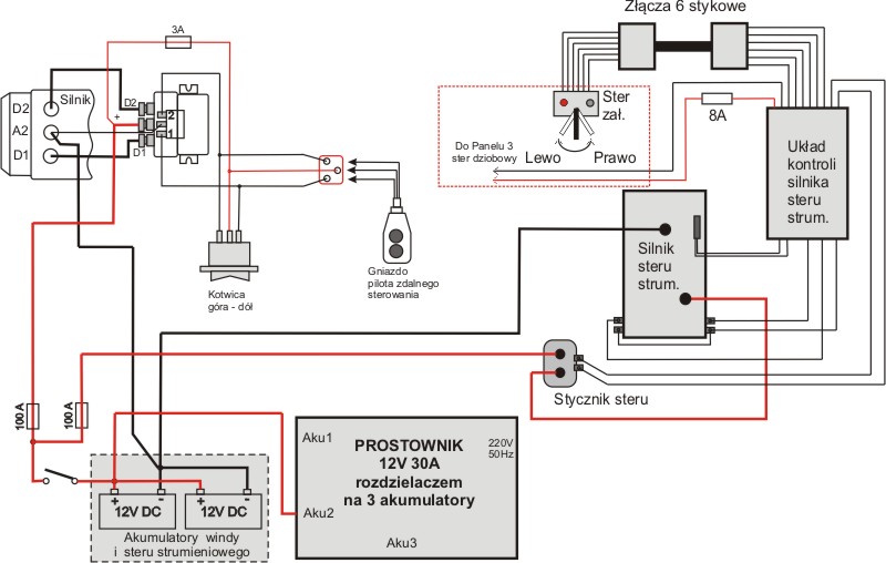 Zaznaczam jednak że kolory przewodów, niebieski i biały (lewo, prawo) na panelu sterującym, mogą mieć odwrotne funkcje od tych zastosowanych na sterze, czyli niebieski - prawo, biały - lewo. W różnych modelach producenta, różnie było to montowane. Jeżeli chodzi o sprawdzenie poprawności podłączenia tych przewodów (tzn. czy lewo, na pewno będzie lewo) sam producent dopuszcza metodę że tak się wyrażę "prób i błędów". Jeżeli po podłączeniu okaże się że kierunki zostały pomylone, podłączamy przewody odwrotnie tak, aby ster skręcał w odpowiednią stronę. Oczywiście nie robimy tego na sucho, no chyba że mamy kilka takich sterów i stać nas żeby kilka sztuk poświęcić