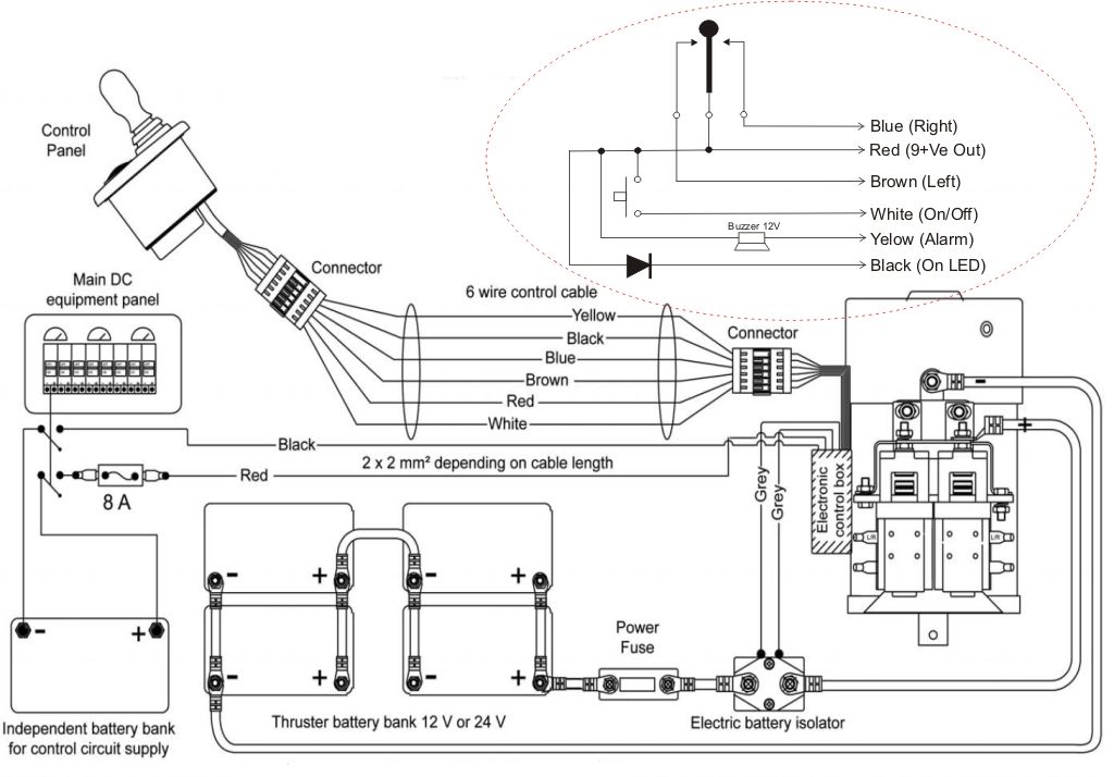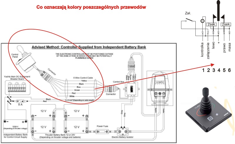 Zaznaczam jednak że kolory przewodów, niebieski i biały (lewo, prawo) na panelu sterującym, mogą mieć odwrotne funkcje od tych zastosowanych na sterze, czyli niebieski - prawo, biały - lewo. W różnych modelach producenta, różnie było to montowane. Jeżeli chodzi o sprawdzenie poprawności podłączenia tych przewodów (tzn. czy lewo, na pewno będzie lewo) sam producent dopuszcza metodę że tak się wyrażę "prób i błędów". Jeżeli po podłączeniu okaże się że kierunki zostały pomylone, podłączamy przewody odwrotnie tak, aby ster skręcał w odpowiednią stronę. Oczywiście nie robimy tego na sucho, no chyba że mamy kilka takich sterów i stać nas żeby kilka sztuk poświęcić