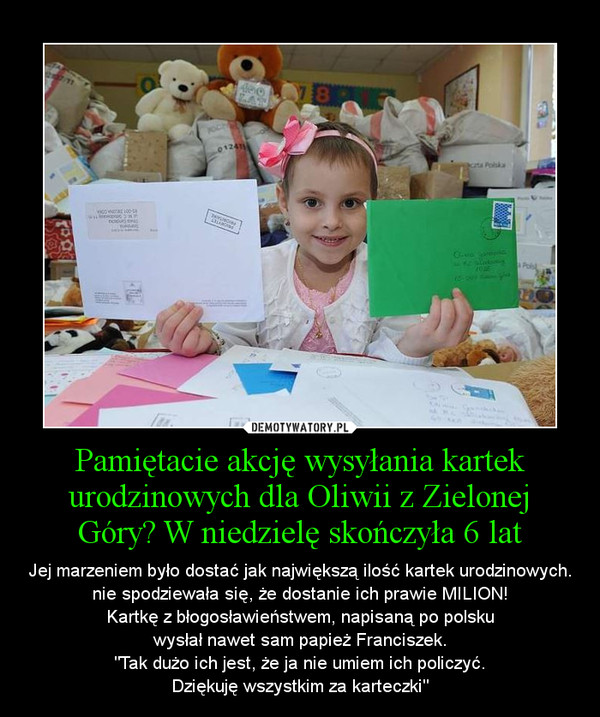 Dziś o godzinie 19 30 TV 1 w dzienniku mała Oliwia podziękowała wszystkim za kartki z życzeniami osobiście .