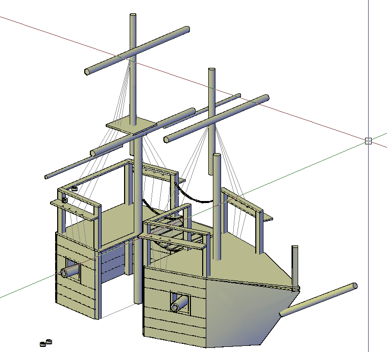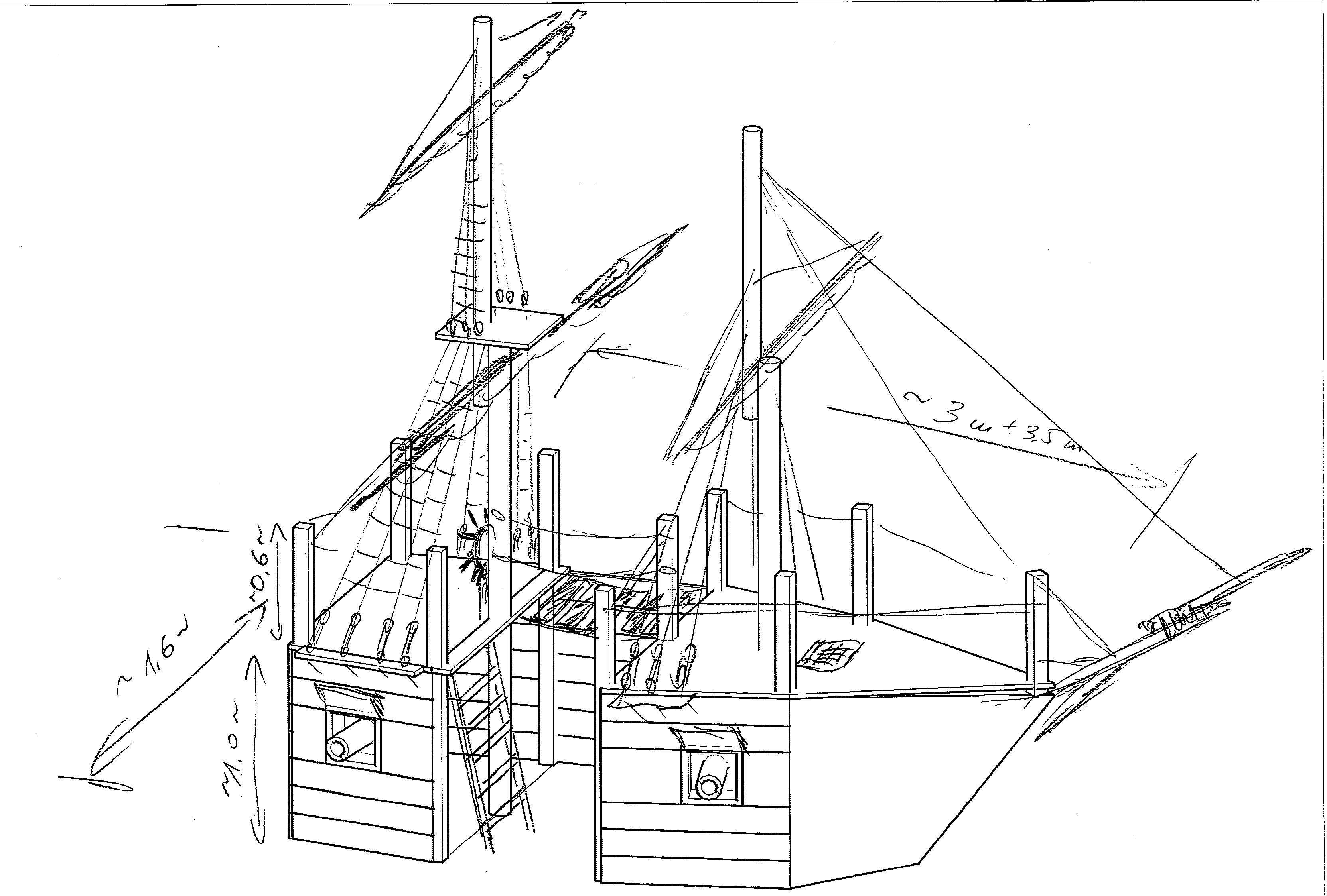 Moje pomysły: pod spodem pojawią się 2 zadaszenia na dziecięce rowerki, podest na wys. ok. 1m, wejście drabinką, przejście między pokładami mostkiem linowym, poręcze albo sztywne, albo z liny (nie zdecydowałem); imitacja luf armatnich zagłębiona w kadłub ok. 0,15m; podłoga i "woda" obok będzie wysypana piaskiem plażowym
