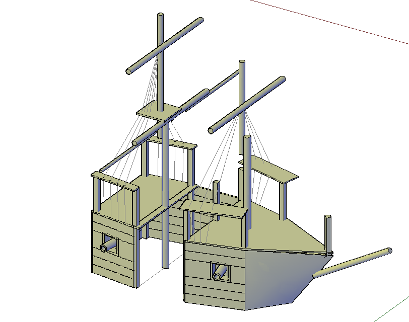 Moje pomysły: pod spodem pojawią się 2 zadaszenia na dziecięce rowerki, podest na wys. ok. 1m, wejście drabinką, przejście między pokładami mostkiem linowym, poręcze albo sztywne, albo z liny (nie zdecydowałem); imitacja luf armatnich zagłębiona w kadłub ok. 0,15m; podłoga i "woda" obok będzie wysypana piaskiem plażowym