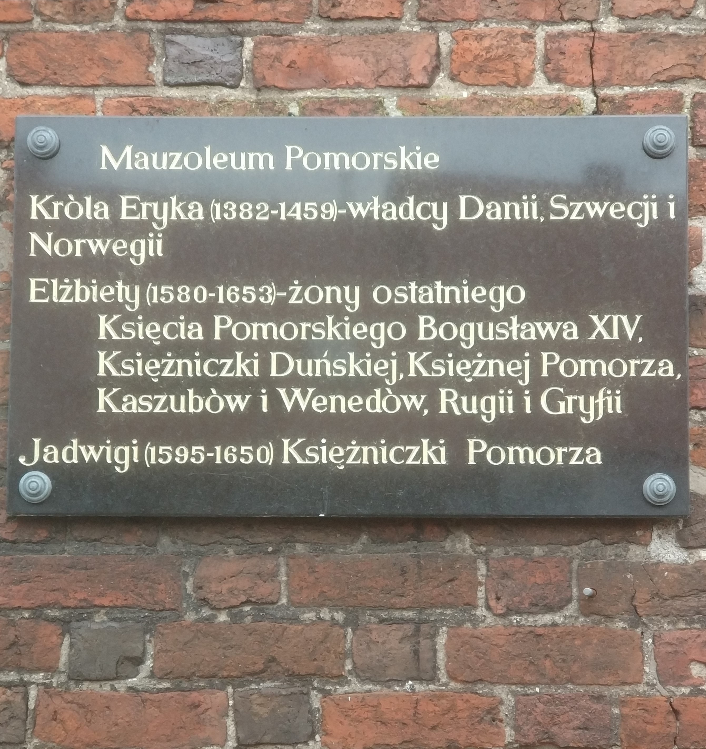 Odwiedziliśmy też króla Eryka. Tablica na kościele mariackim w Darłowie.