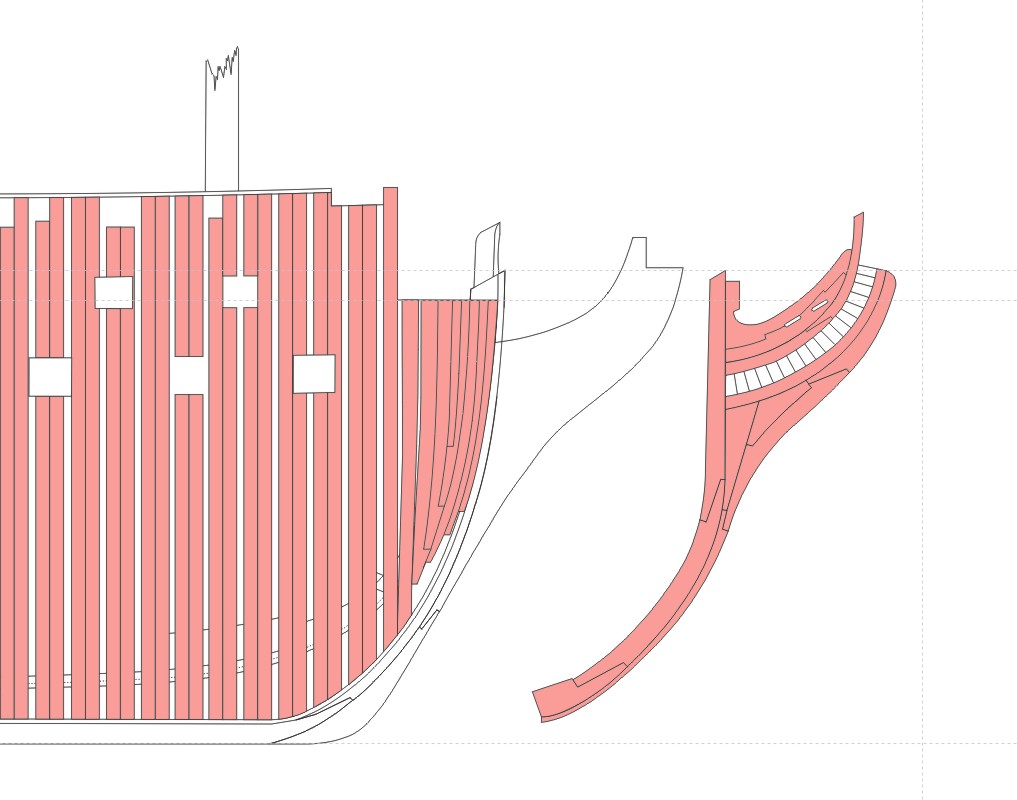 Plan po wyliczeniu przekrojów wręg. Nie jestem pewien czy nie popełniłem błędu zwężając je w galerii rufowej- są według tych samych proporcji co pozostałe.