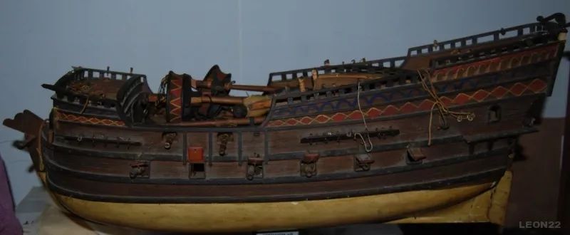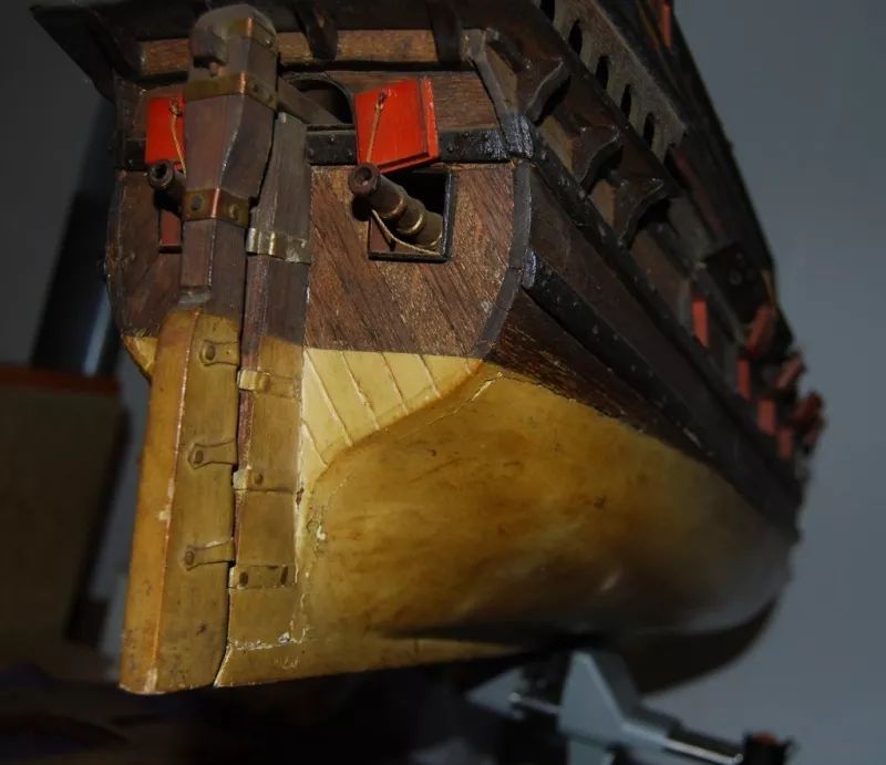 W moim minimum 100 letnim Wodniku 1:30 temat wygląda tak z galionem, lustrem rufy i armatkami. Wiadomo, że to tylko pogląd i czyjaś interpretacja ale trzeba pamiętać że planów za bardzo nie było tak jak teraz. Kto co i jak nie wiem. Kupiłem zrujnowanego Ziomek galionowy nieźle wykonany ma źrenice i nawet 6 -ciopak i sutki Szkoda, że nie ma drugiej ręki może w niej coś trzymał. Armatki też różne a nie wszystkie takie same. Sfatygowany kadłub od dziobu jest bardziej w stylu holenderskim albo jak Endeavour a nie inne Wodniki i Rotter. No i 1:30 to jest słuszna sala żeby wszystko ładnie pokazać. W środku w moim stało w kajucie łóźko które się zachowało , stół któremy dorobiłem nogi i krzesła oraz beczółka z winem która się zachowała