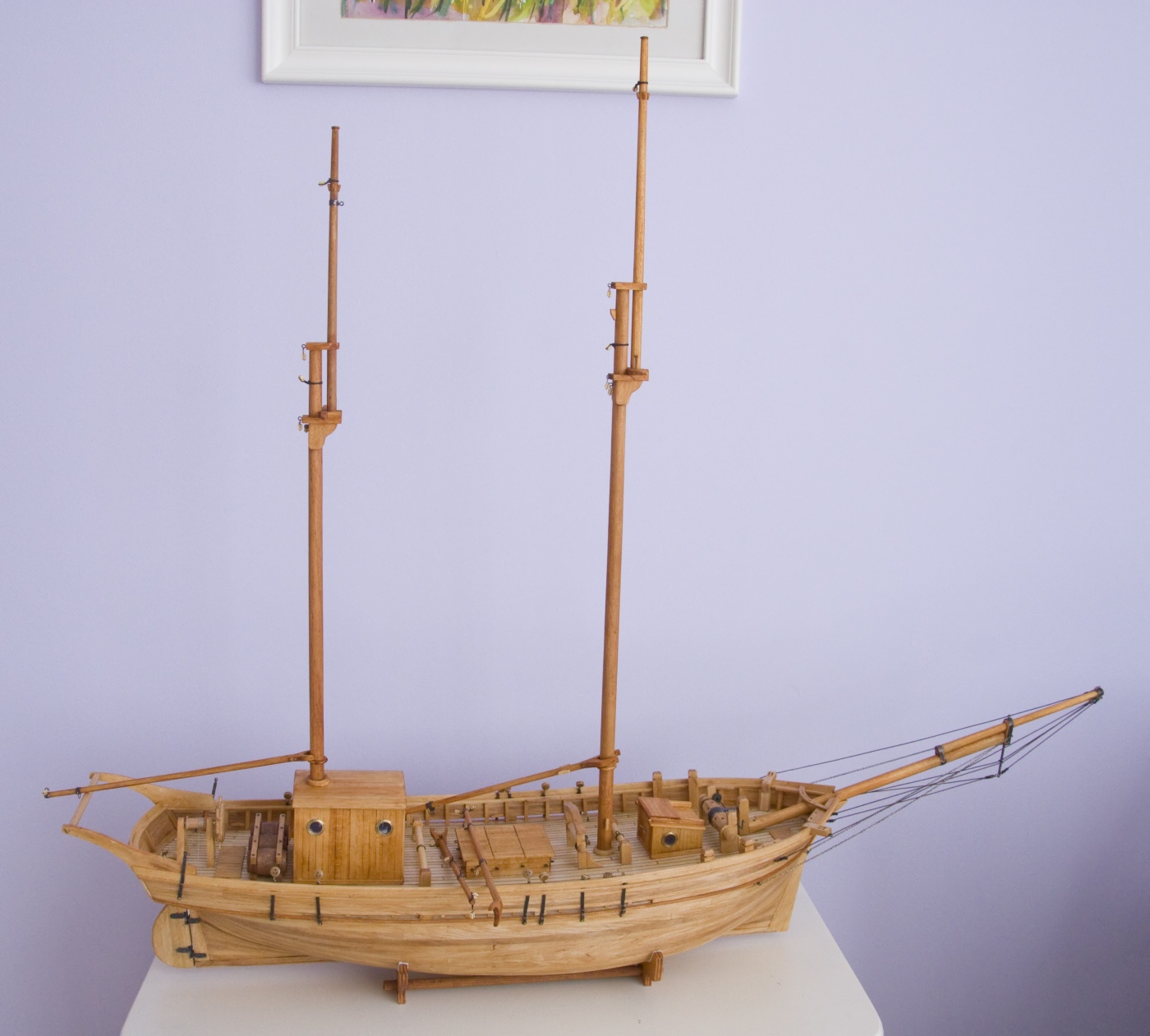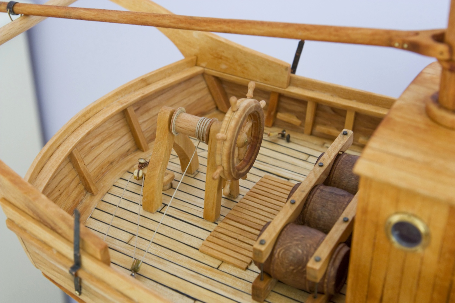 Kadłub wykonany jest z olchy a wszystkie nadbudówki z listewek z topoli i pomalowane bejcą olcha.