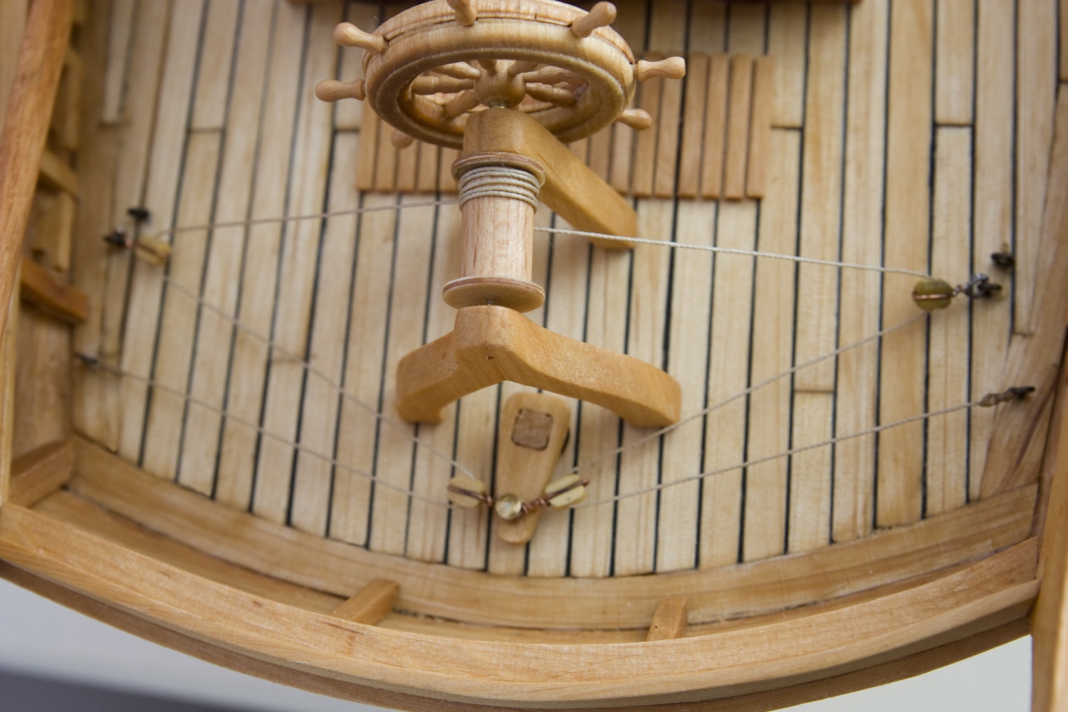 Pokład wykonałem z listewek uzyskanych z deski do krojenia. Miała być brzozowa, ale była produkcji chińskiej i chyba było inne drewno.