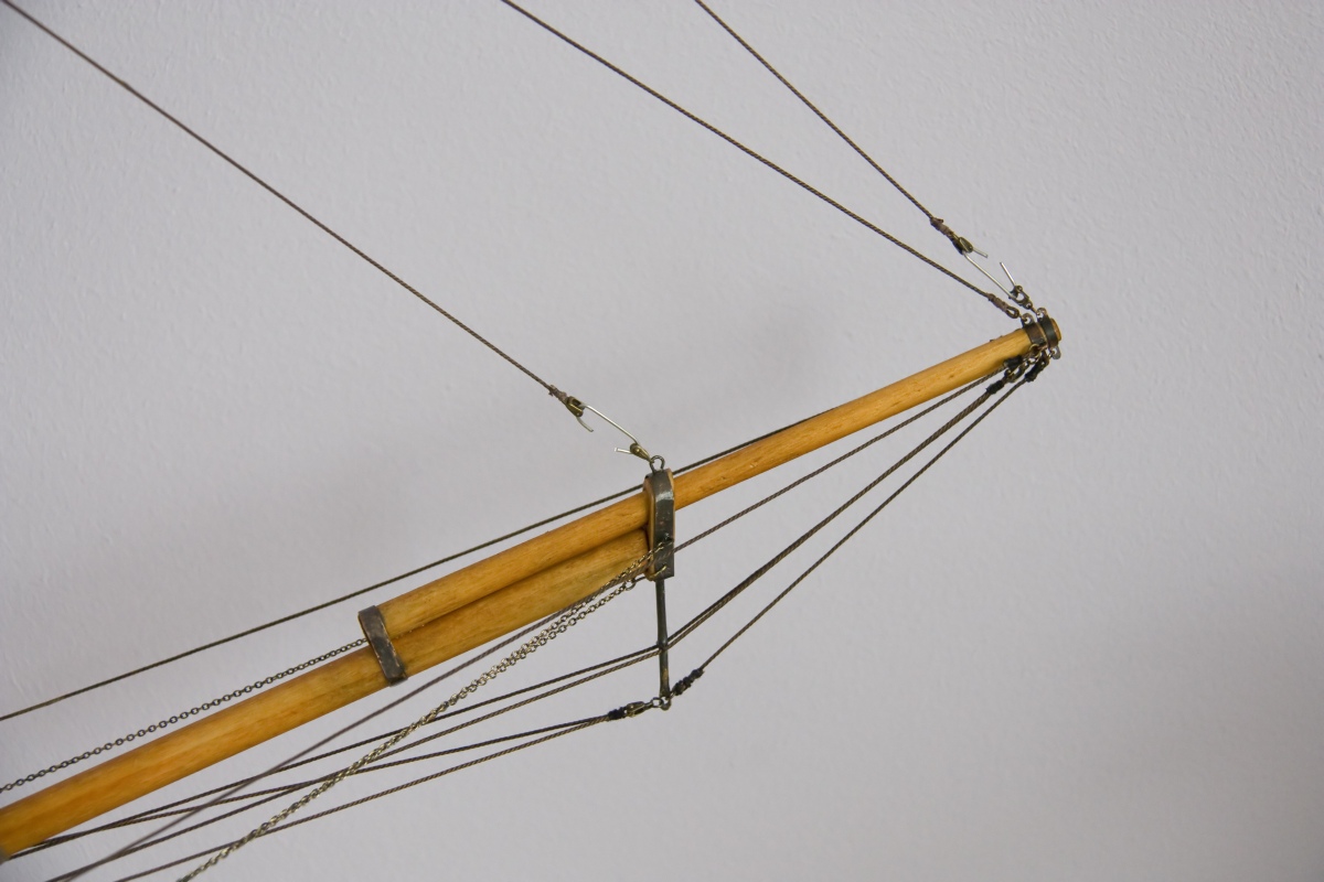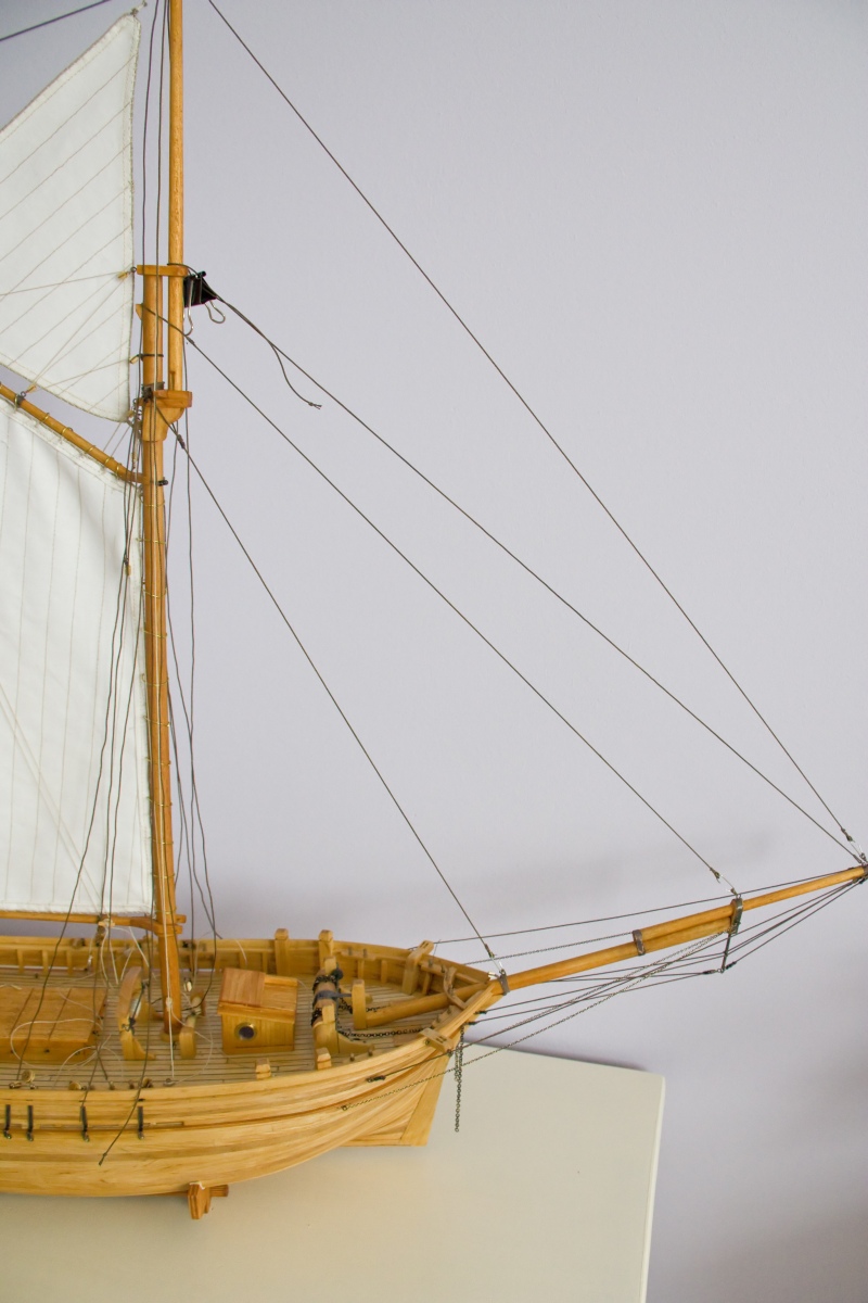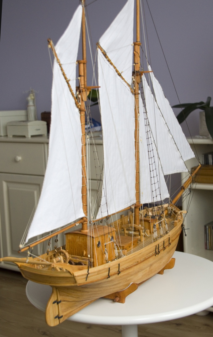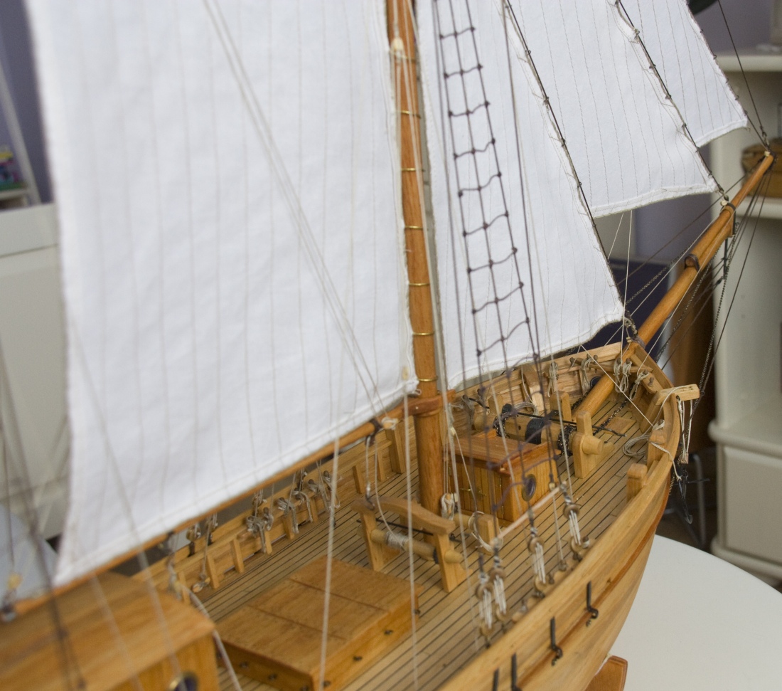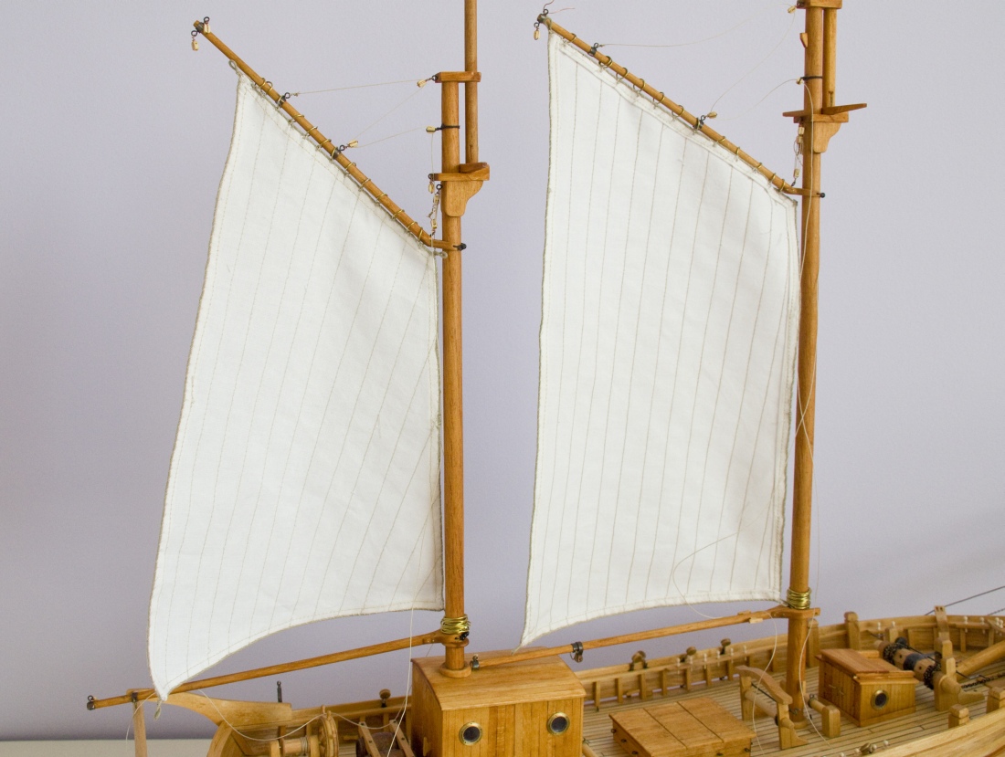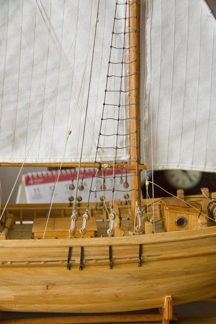 Trochę nietypowy sposób wykonywania olinowania, ale po doświadczeniach z Cutty Sark stwierdziłem, że tak będzie łatwiej. Powiesiłem żagle i zrobiłem olinowanie ruchome bez mocowania lin na stałe. Olinowanie stałe jest tylko wiązane do masztów.