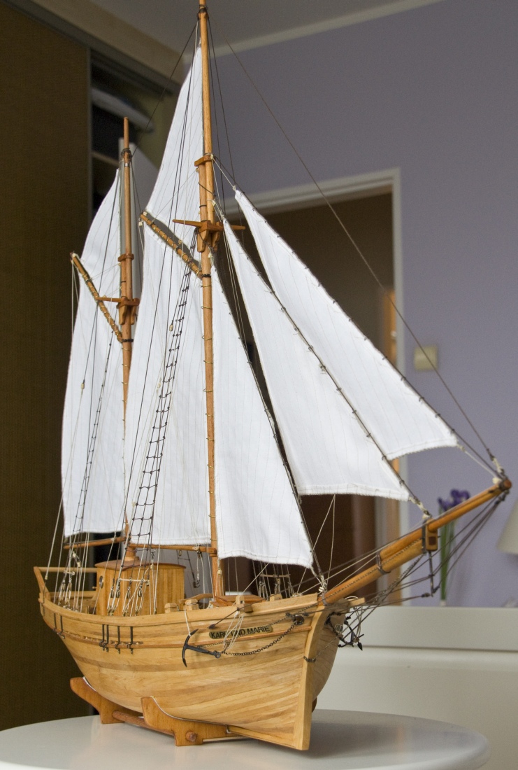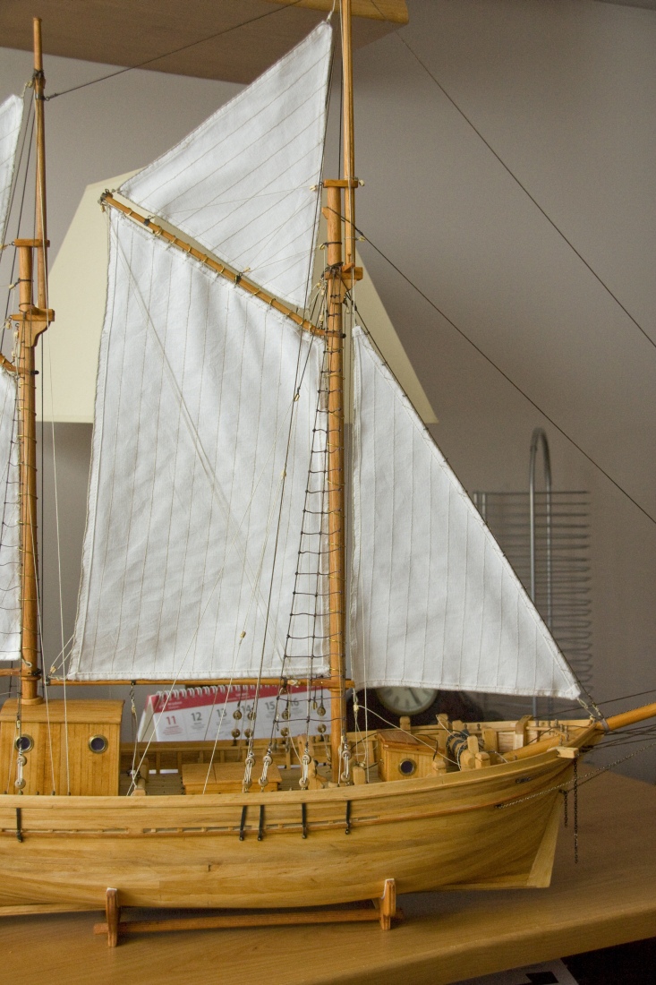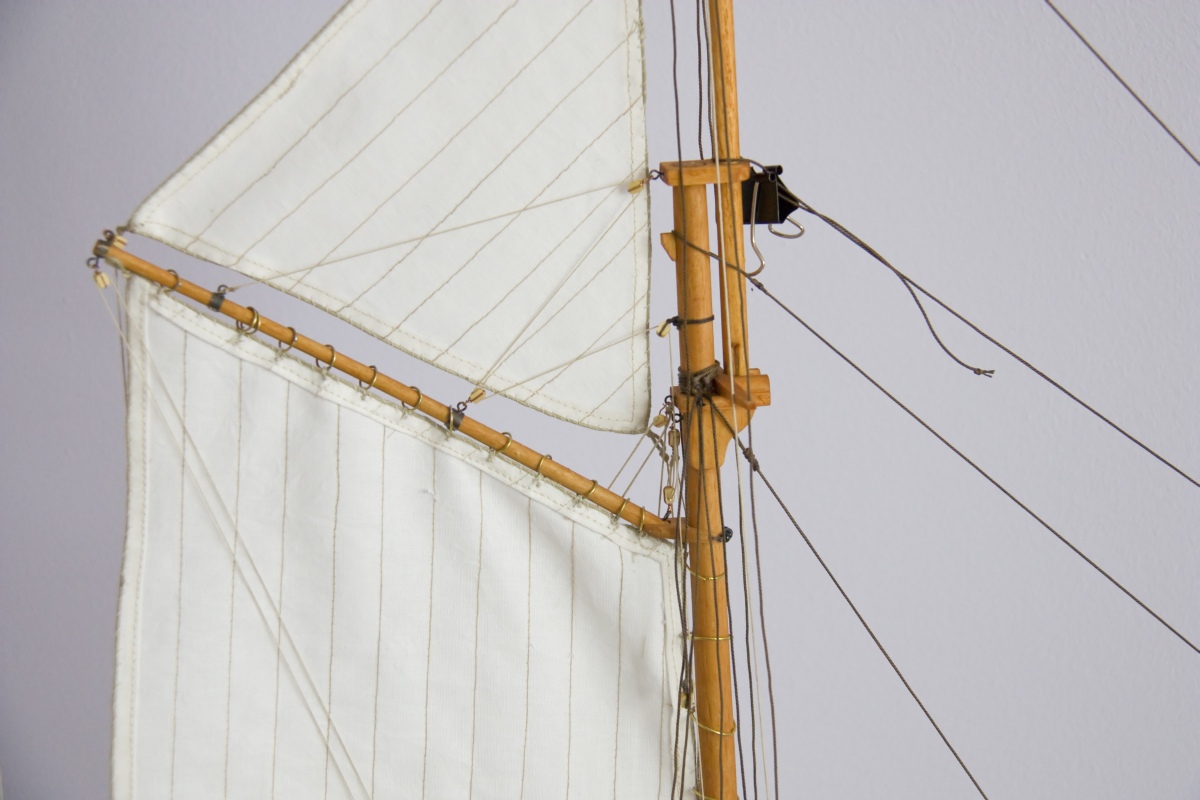 Kolejna próba to nasączenie żagli Caponem. Ta metoda jest dobra do żagli rejowych. Można je wtedy ładnie uformować. Przy dużych żaglach gaflowych wyglądały one jak z kartonu. Ostatecznie krawędzie żagli powinąłem i obszyłem na maszynie. Liklinę przyszyłem na okrętkę Wykonanie na miarę moich umiejętności krawieckich (czyli prawie żadne).