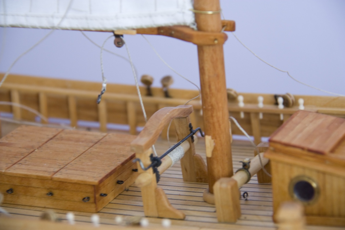 Przekładnie zębate windy kotwicznej i ładunkowej zrobiłem z ryflowanych kołków bukowych Zęby wypiłowałem trójkątnym iglakiem Bulaje i koło sterowe zostały zakupione.
