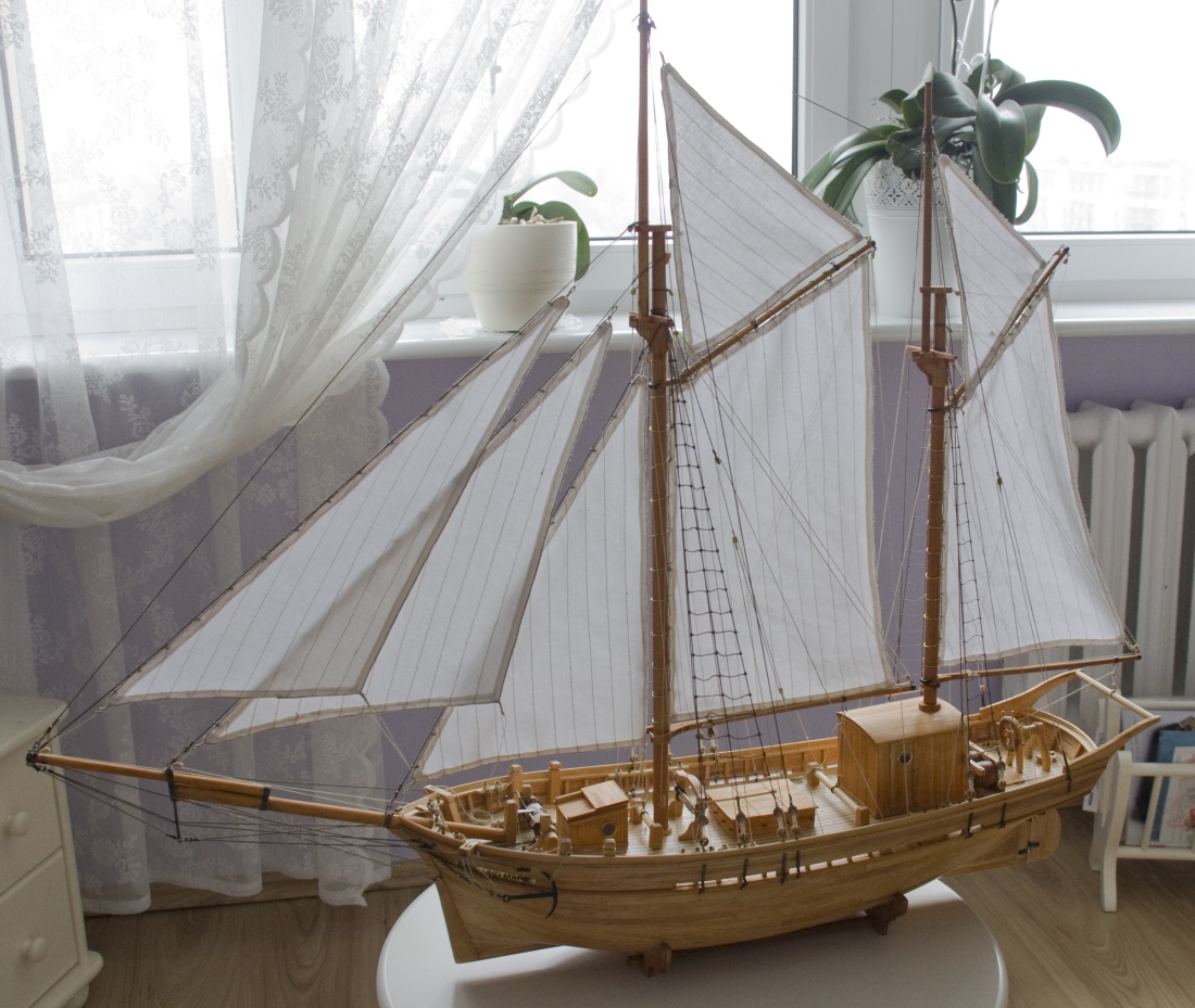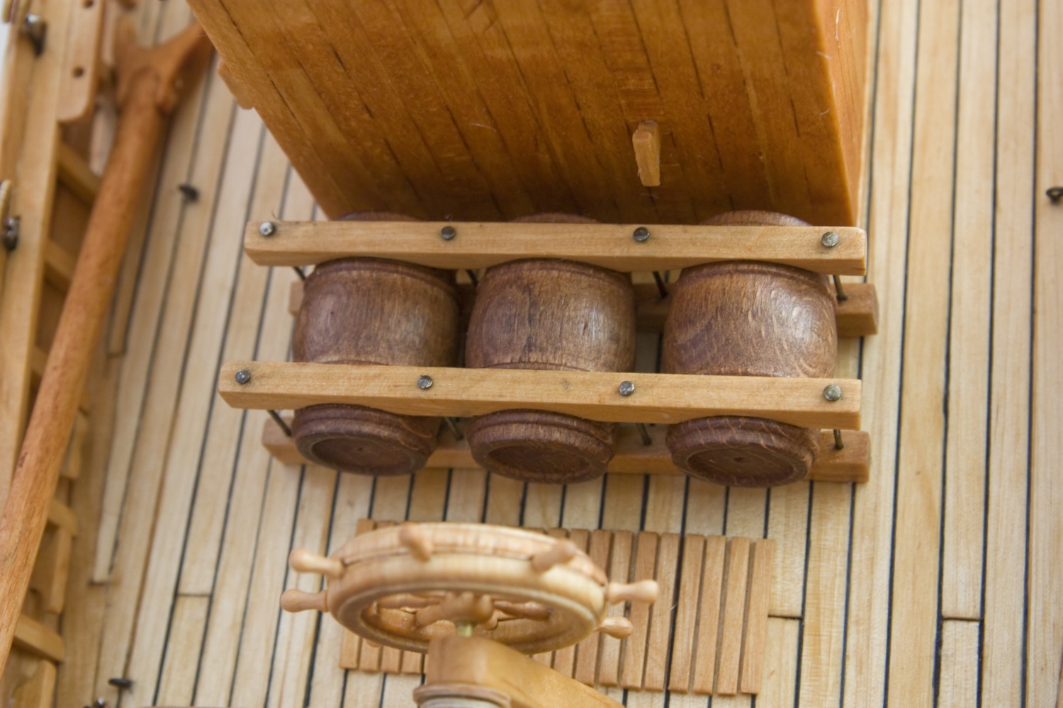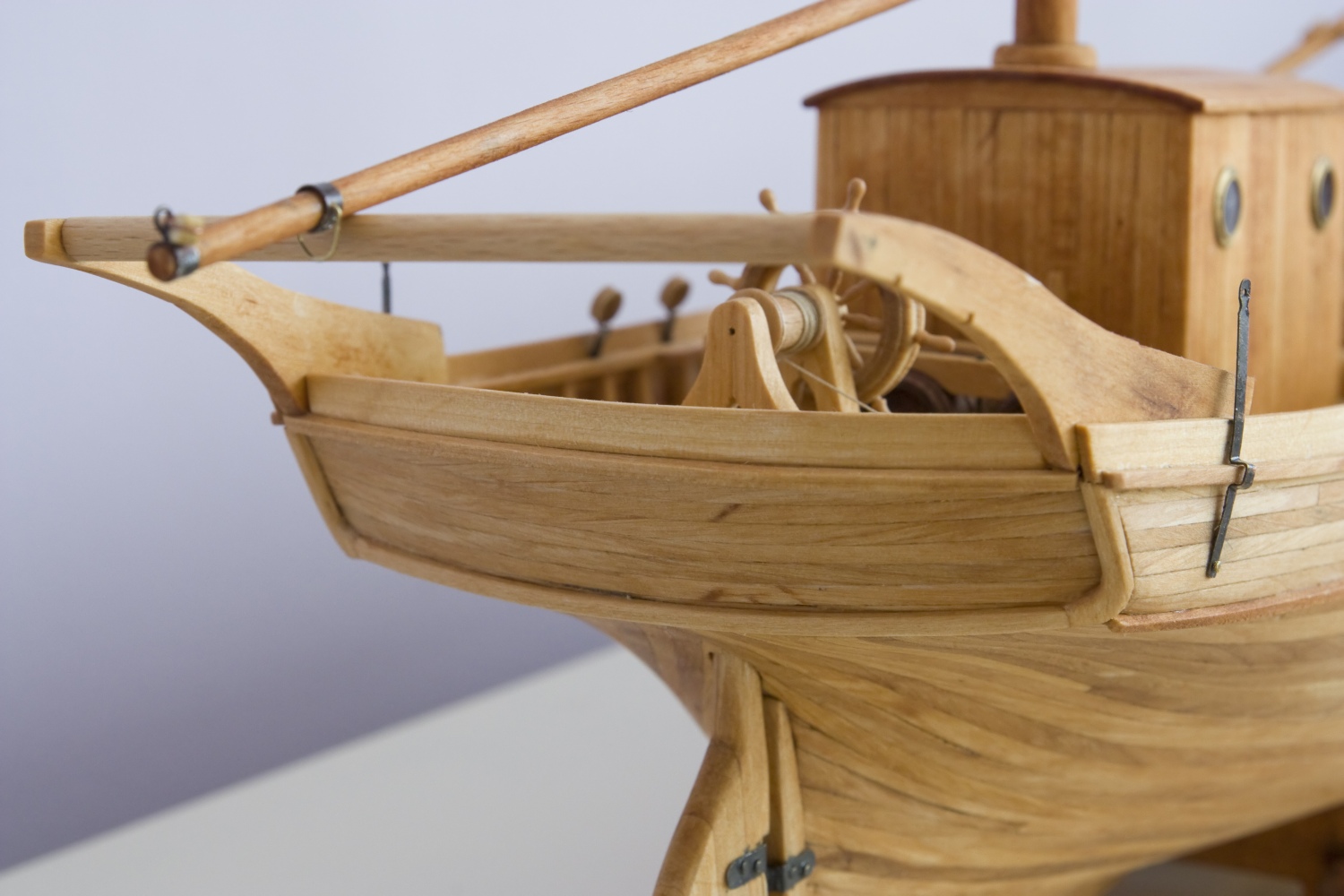 Kadłub wykonany jest z olchy a wszystkie nadbudówki z listewek z topoli i pomalowane bejcą olcha.