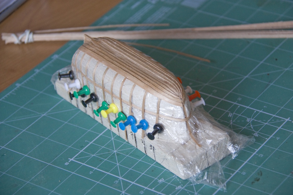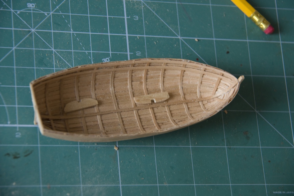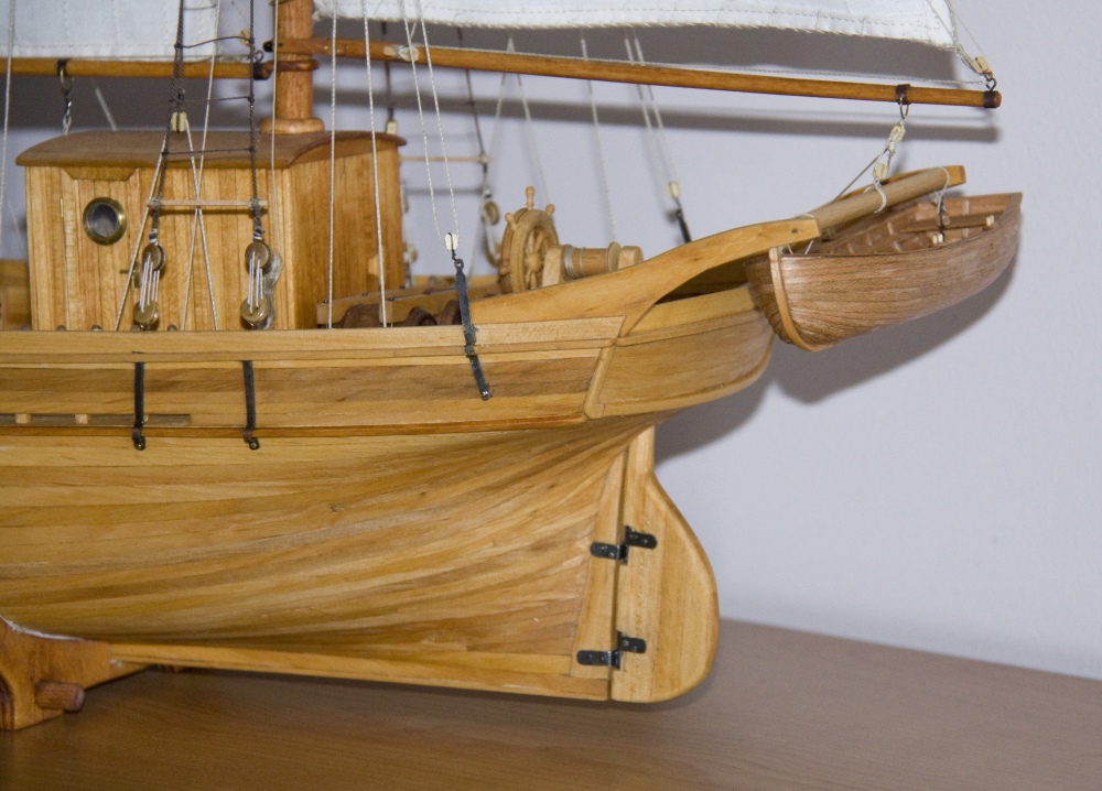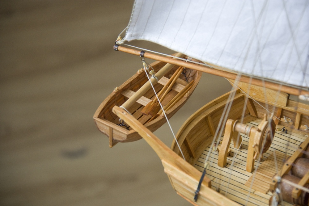 Prace zbliżają się powoli do końca. Szalupa zrobiona i powieszona. Miałem kłopot ze zdjęciem szalupy z kopyta. Musiałem je wydłubywać. Dobrze że kopyto było zrobione z balsy, to łatwo się je wydłubało. Jutro będę się zastanawiał jak zrobić flagę.