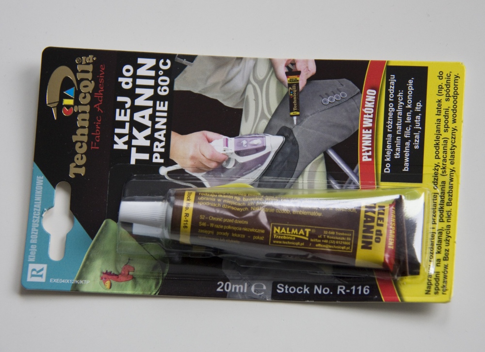 Flagę zrobiłem z kolorowych wstążek sklejonych klejem do tkanin. Klej jest bezbarwny, elastyczny i bardzo mocny. Klejone materiały można prać, prasować, itd.