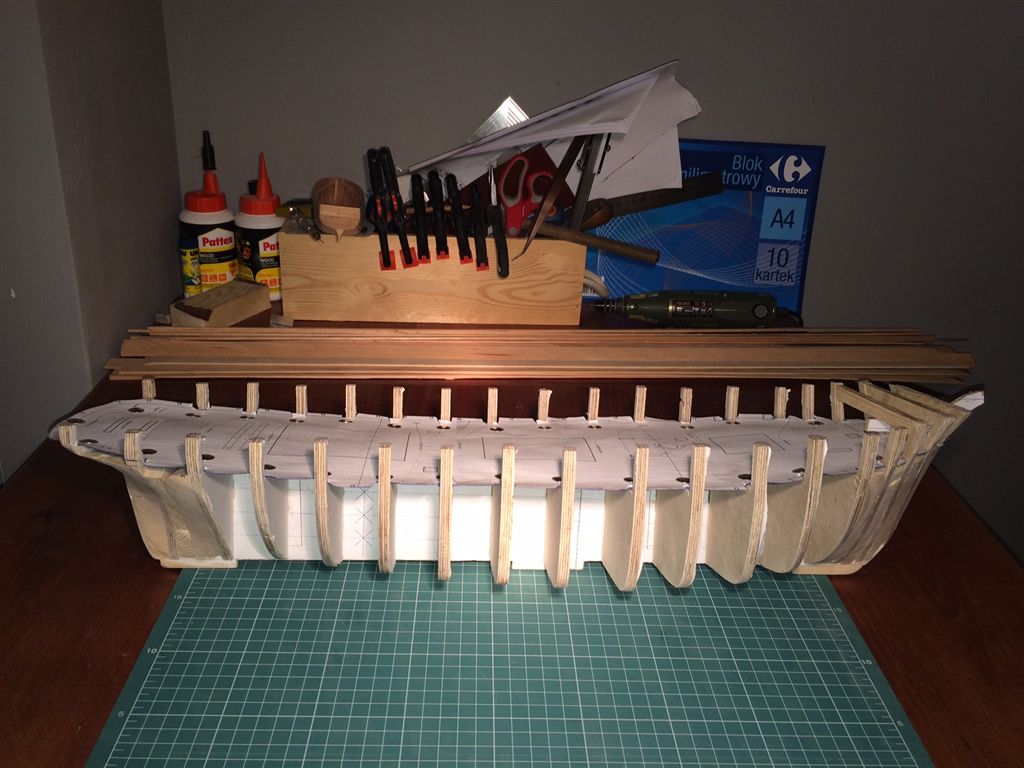 Szlifowanie dziobu i rufy uważam, za zakończone. Niestety trzeba było poprawić. Ruszyła też produkcja listewek na poszycie - na razie powtarzalność grubości listewek na całej długości nie jest dla mnie zadowalająca. Mam nadzieję, że przy kolejnych będzie już tylko lepiej:)