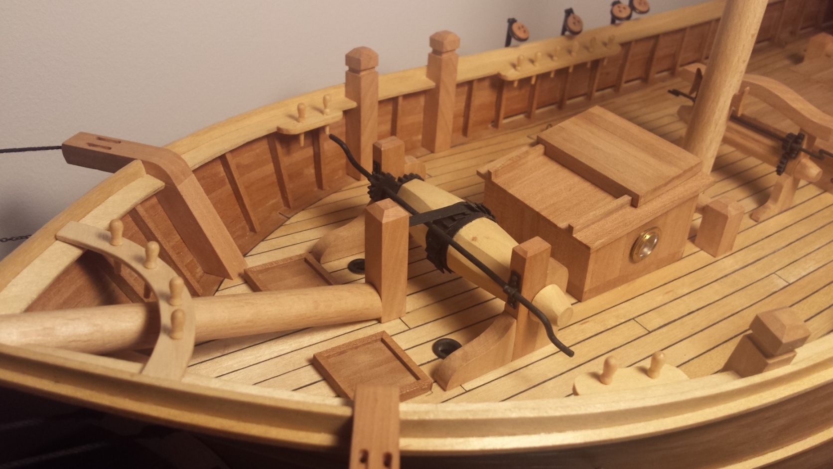 Teraz trochę szczegółów o samym modelu. Poszycie jest jednowarstwowe z gruszy, pokład z brzozy a imitacja uszczelnienia to czarny papier. Wyposażenie pokładu to również grusza a wszystkie jasne elementy to listwy lub fornir brzozowy. Maszty wykonane z wałeczków bukowych z marketu. Listwy z gruszy i brzozy oraz kawałek deseczki z gruszy zakupiłem oczywiście u Mirka. Pawęż wykonałem z forniru natomiast koło sterowe, beczki i bulaje zostały zakupione. Od Mirka będą również bloczki, jufersy, knagi, linki i może nagle. W trakcie wykonywania są okucia. Brak jeszcze haczyków, klamek itp.