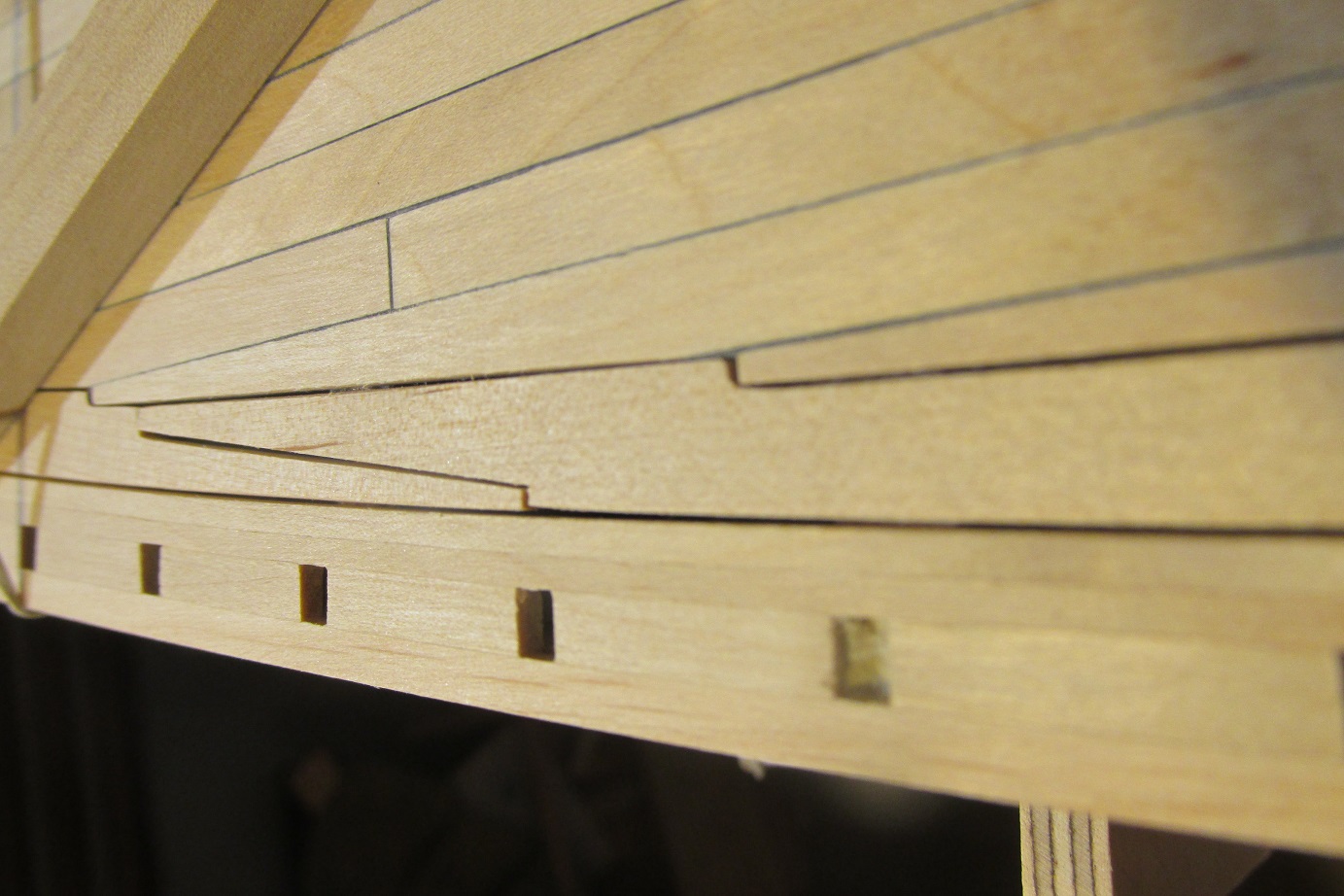 Panowie, nie ma się co spierać o swoje. Ten wzór na mym "Victorym", to jest tzw. 4:1, tj. połączenie między plankami występuje na co 4tej plance, czyli między sąsiadującymi połaczeniami są dokładnie trzy całe planki (tak wybrałem). I to sie powinno powtarzać. Im większa jednostka, tym więcej tych litych planek między połączeniami - taka była zasada. Ale tylko największe olbrzymy, np. "Santisima Trinidad" mogły mieć cztery ciągłe planki między połaczeniami, reszta raczej trzy.