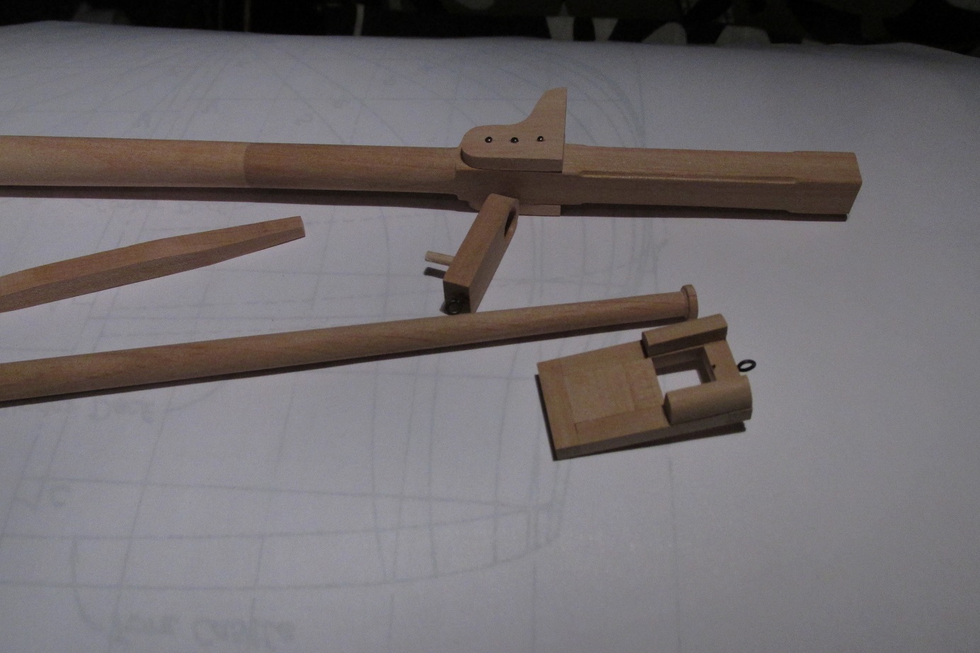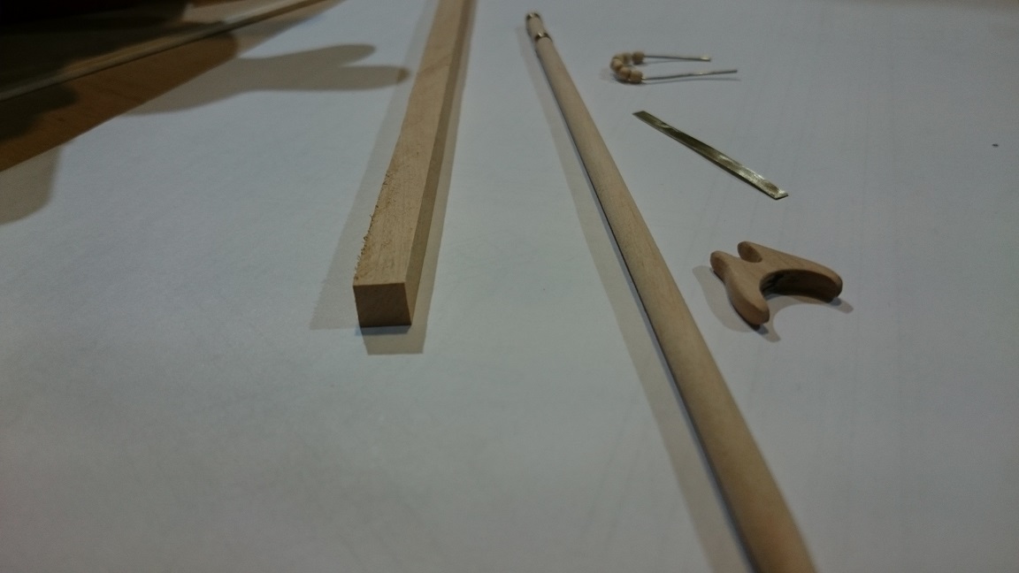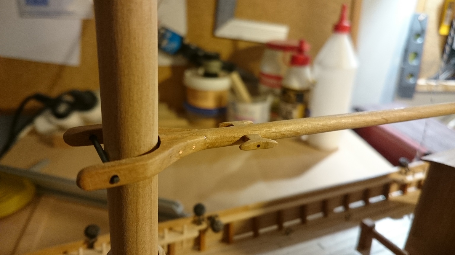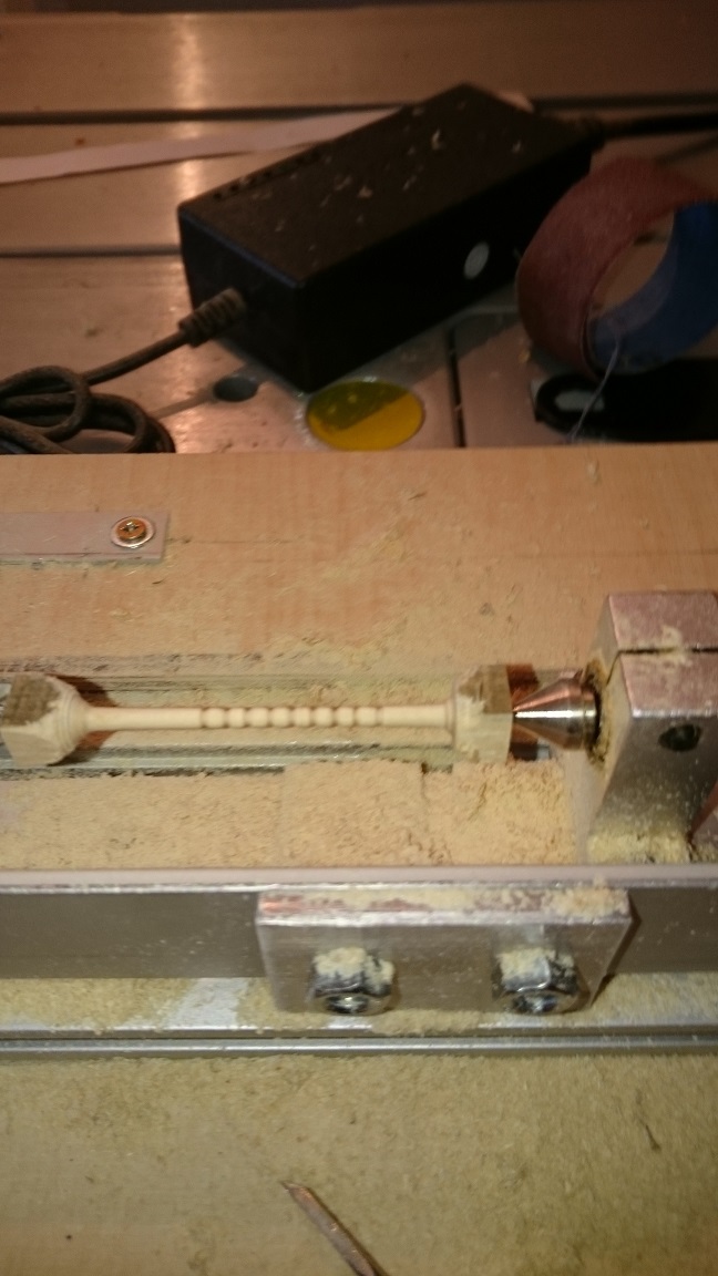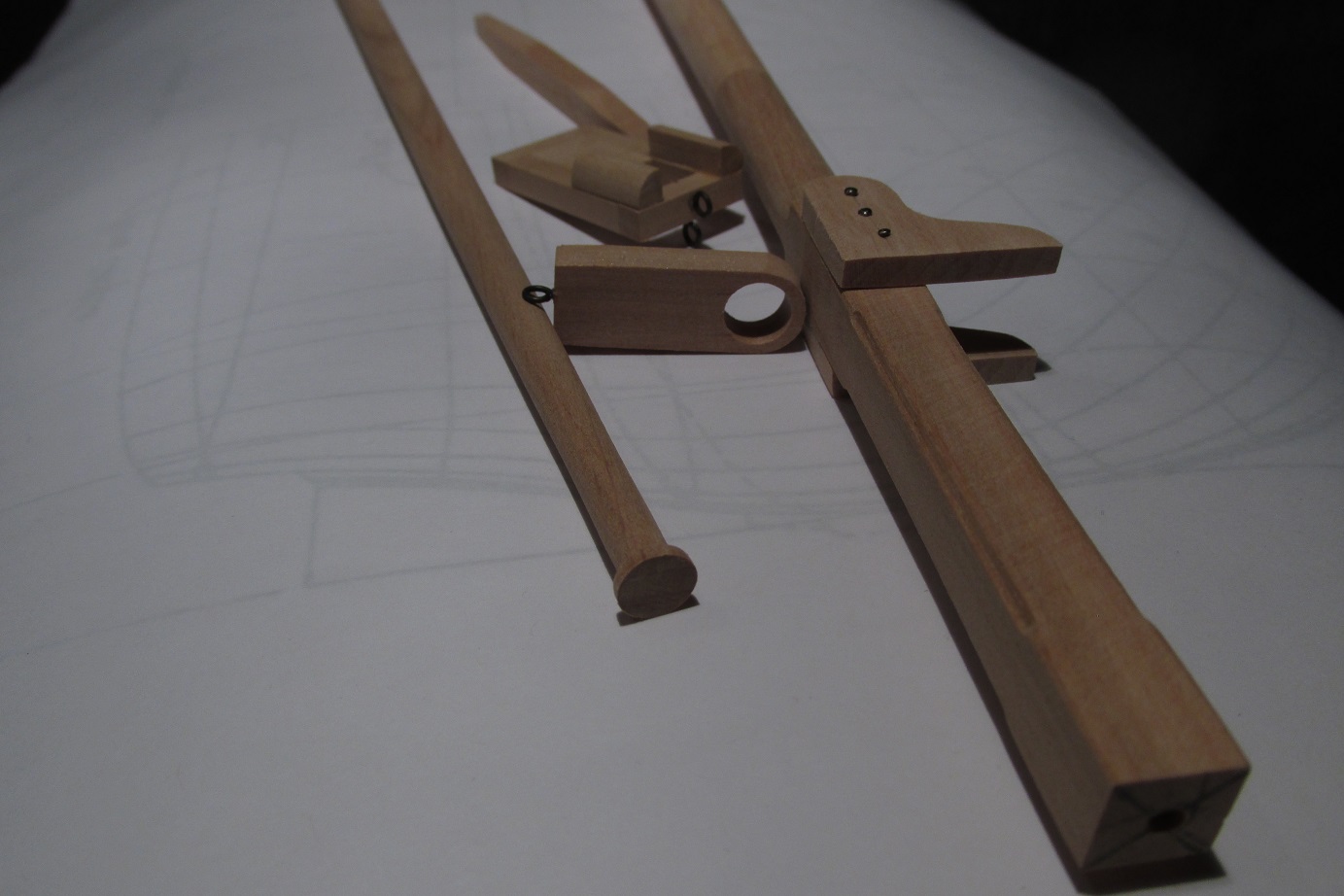 Zabrałem się za maszty, toczę je ze sztachety olchowej. Zostały jeszcze reje, ale w międzyczasie zacząłem skręcać linki z nici bawełnianych. Jak przykazuje mistrz w tej dziedzinie :-), po skręceniu zostawiam na noc naciągniętą linkę a potem impregnuję w miksturze, o której wszyscy słyszeli :-)