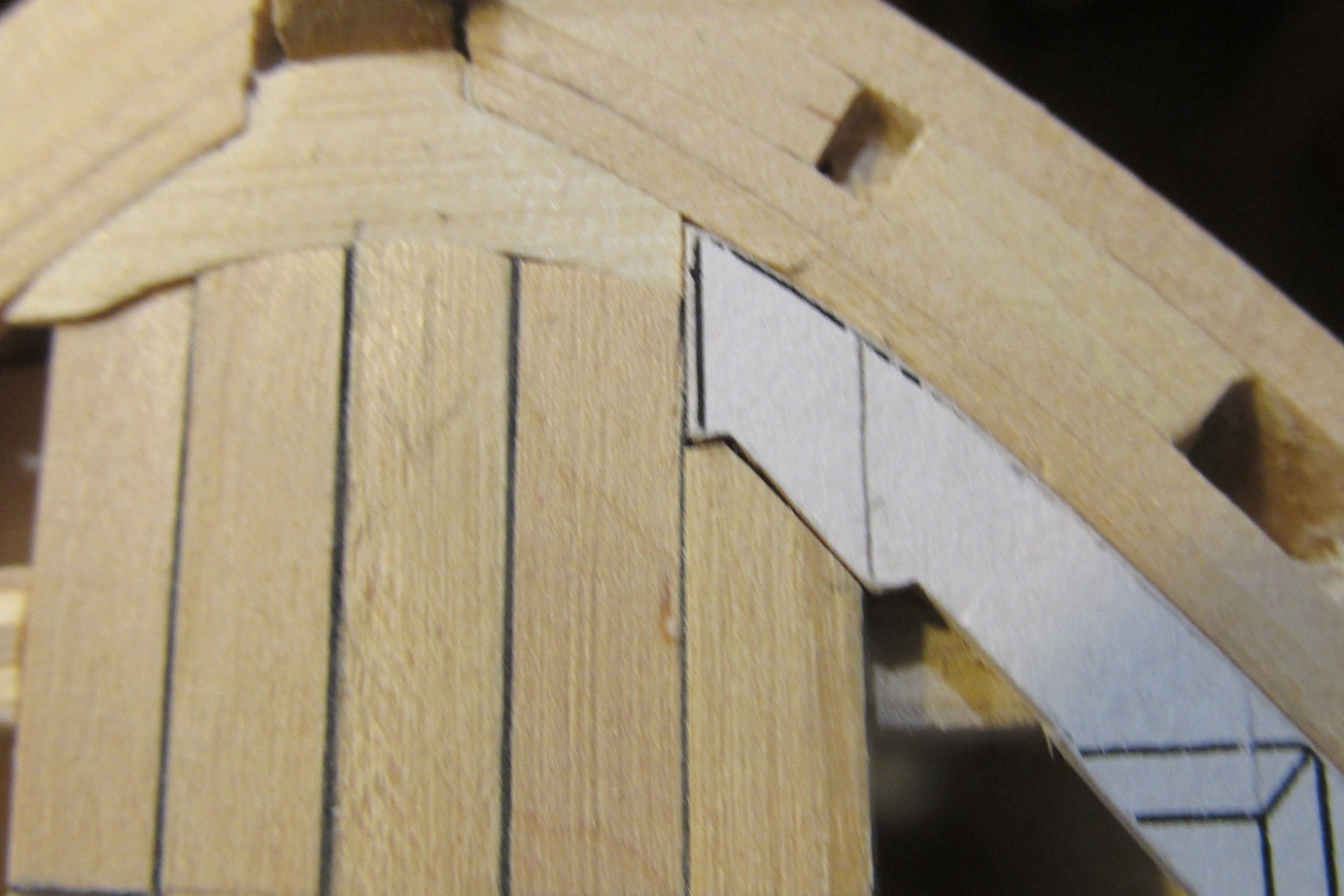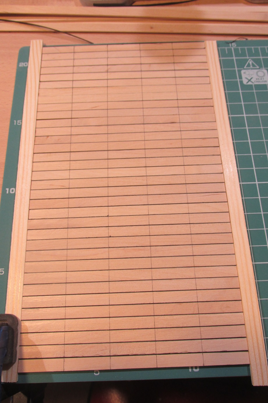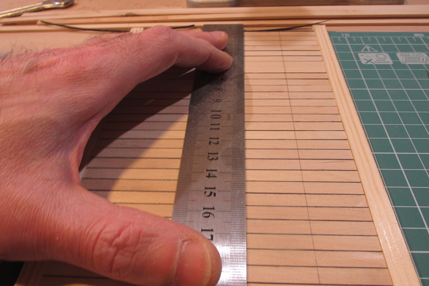Ciągle jestem na etapie wykonywania pokładu. Sięgnąłem do zasobów wiedzy teoretycznej (bo innej nie posiadam i nie da się takiej znaleźć w internecie) i naczytałem się o układach kładzenia desek pokładowych. Spośród tych na które napotkałem, najbardziej podoba mi się "every 5" w układzie 13524. Sporządziłem więc plan odręczny :-) i rozpocząłem pieczołowicie prace :-) Deski będą miały długość 120 cm co oznacza że przy tym układzie będą podzielone na 2,4 mm. Naciąłem więc listew o milimetr dłuższych, aby móc je wyrównać na szlifierce do dokładnego wymiaru i nakleiłem (tu cytat z klasyka :-)) "znanym i lubianym" sposobem na czarny papier. Reszta na fotkach i w komentarzach. Zapraszam i pozdrawiam,