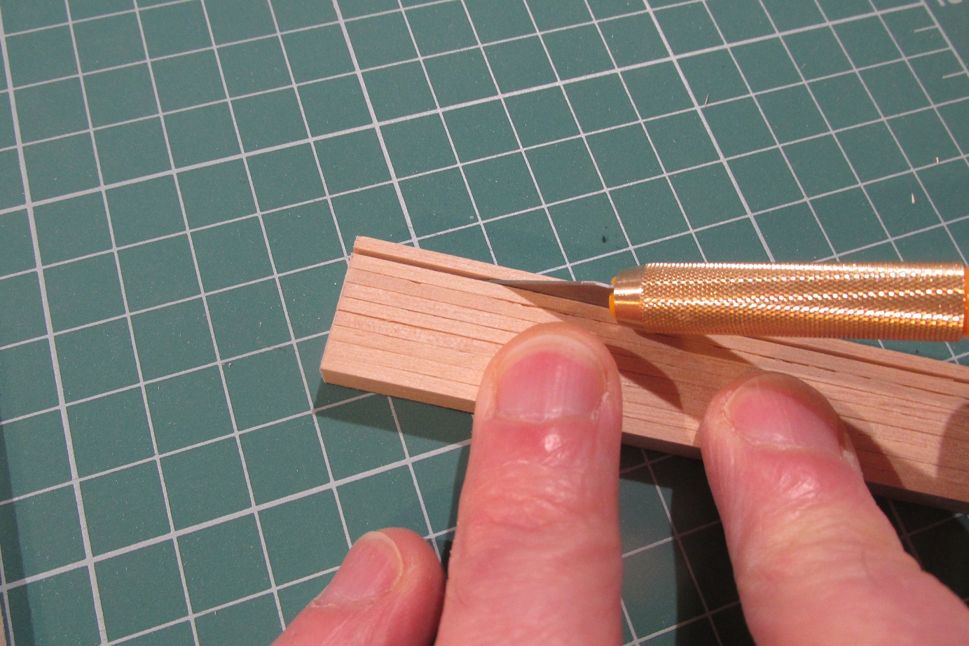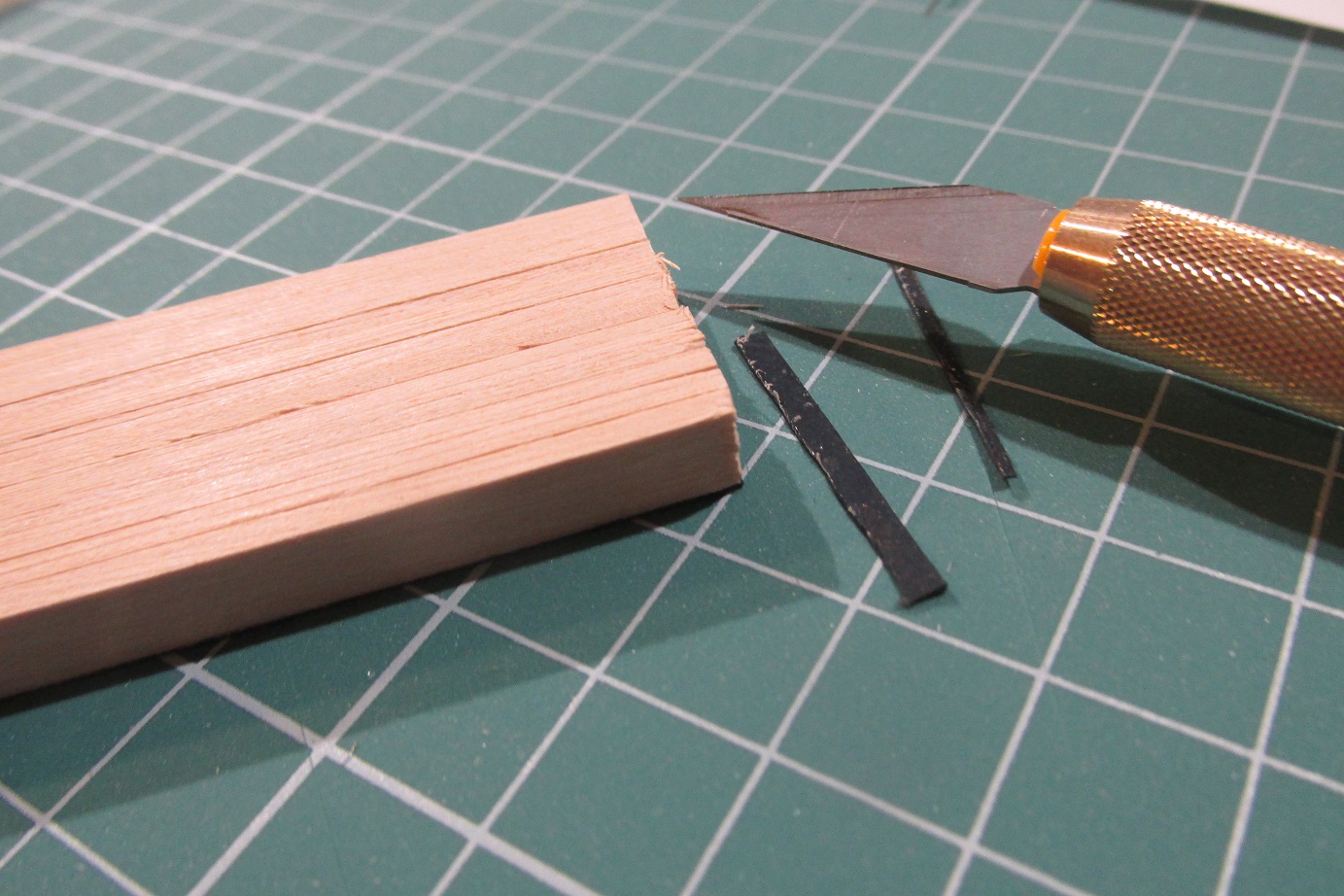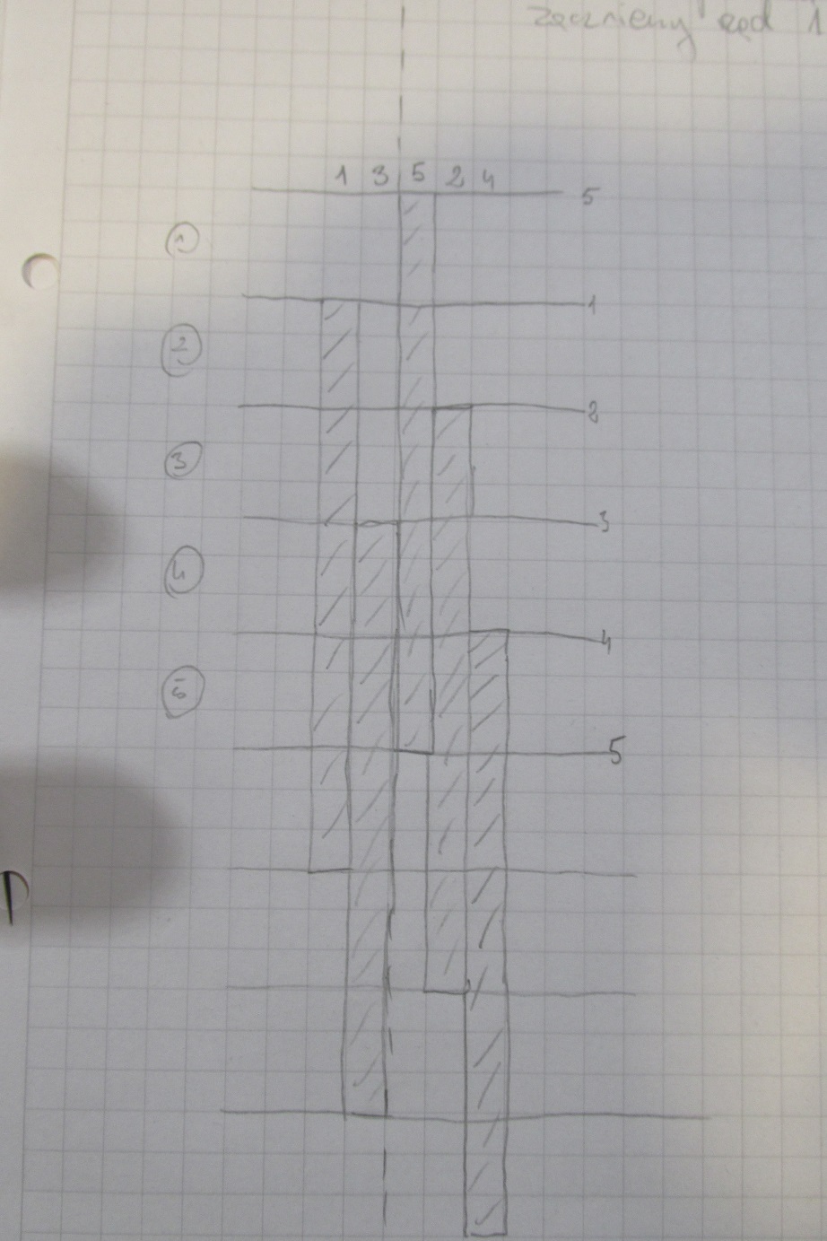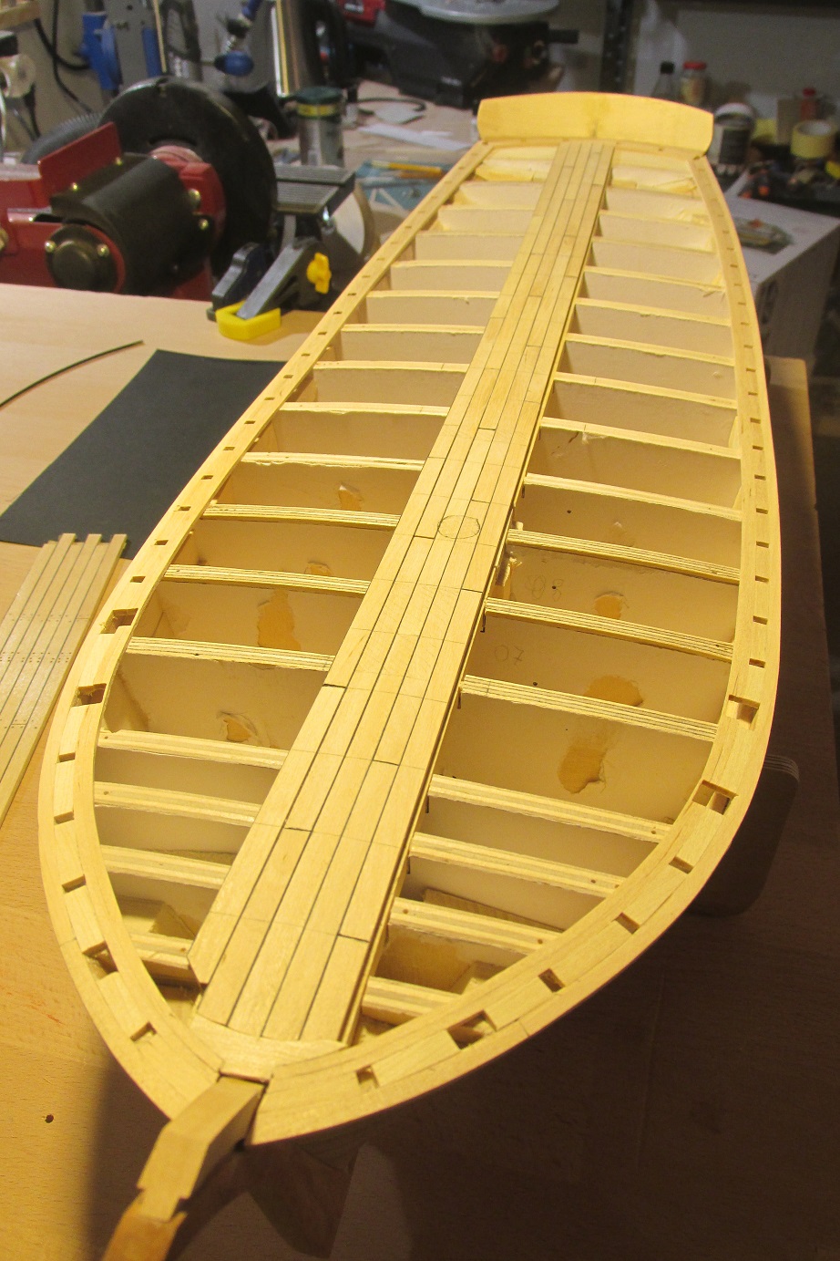 Ciągle jestem na etapie wykonywania pokładu. Sięgnąłem do zasobów wiedzy teoretycznej (bo innej nie posiadam i nie da się takiej znaleźć w internecie) i naczytałem się o układach kładzenia desek pokładowych. Spośród tych na które napotkałem, najbardziej podoba mi się "every 5" w układzie 13524. Sporządziłem więc plan odręczny :-) i rozpocząłem pieczołowicie prace :-) Deski będą miały długość 120 cm co oznacza że przy tym układzie będą podzielone na 2,4 mm. Naciąłem więc listew o milimetr dłuższych, aby móc je wyrównać na szlifierce do dokładnego wymiaru i nakleiłem (tu cytat z klasyka :-)) "znanym i lubianym" sposobem na czarny papier. Reszta na fotkach i w komentarzach. Zapraszam i pozdrawiam,