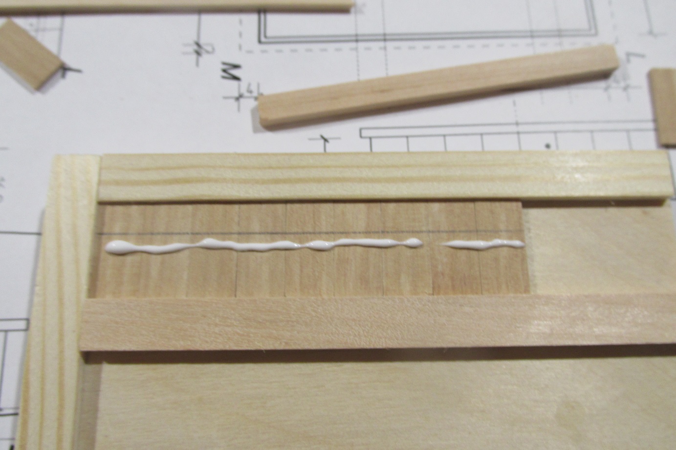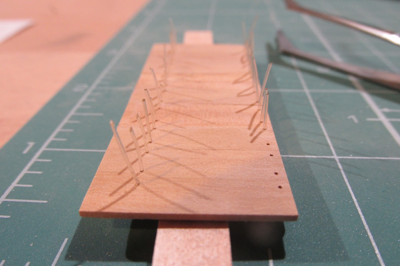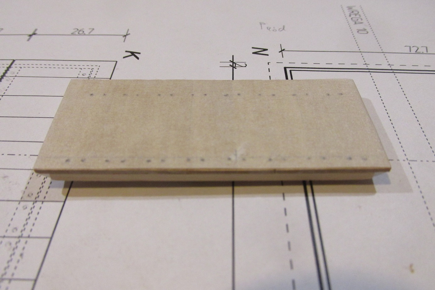 Tak zapalczywie kołkowałem, że złamało mi się wiertło 0,5 mm :-) a ponieważ nie mam zapasowego, to oczywiście zamówiłem i w trakcie czekania zabrałem się za nadbudówkę. Nadbudówka będzie na konstrukcji z listew 5x5 mm. Nie jest to najłatwiejszy sposób, ale żeby się nauczyć trzeba robić i się uczyć :-) Zapraszam do fotek.