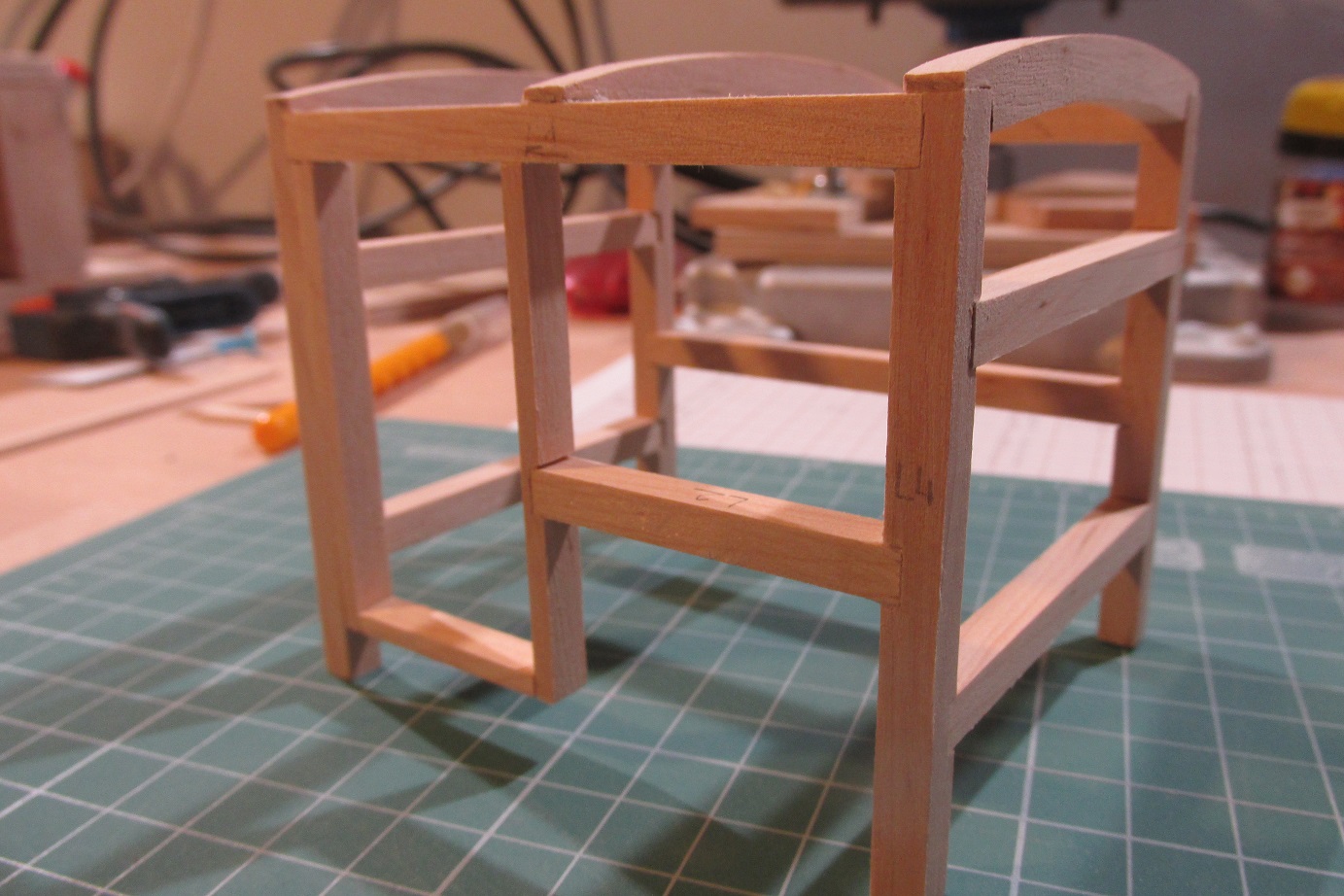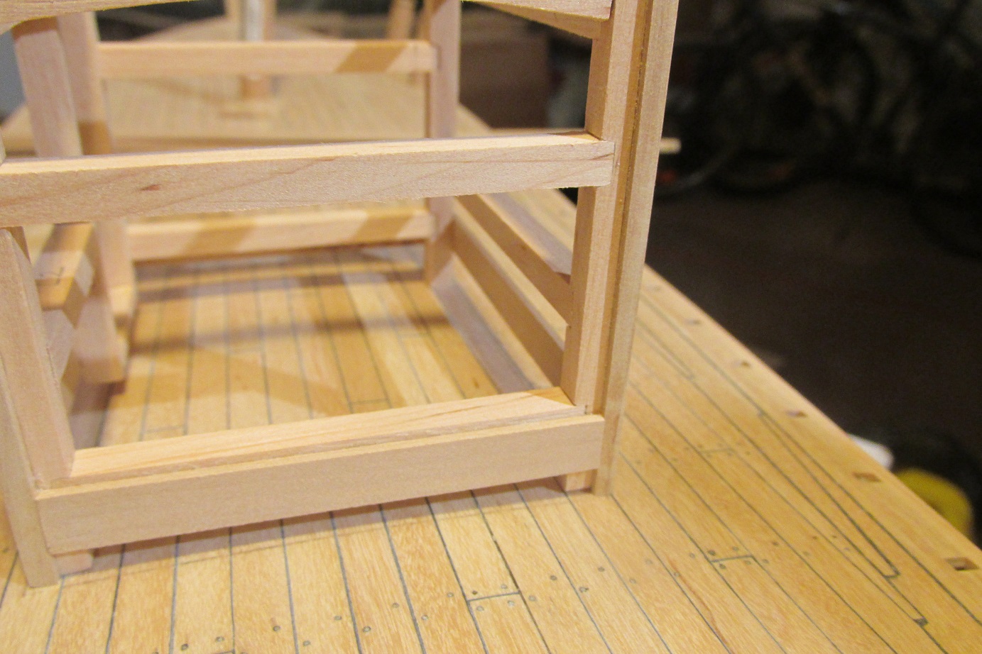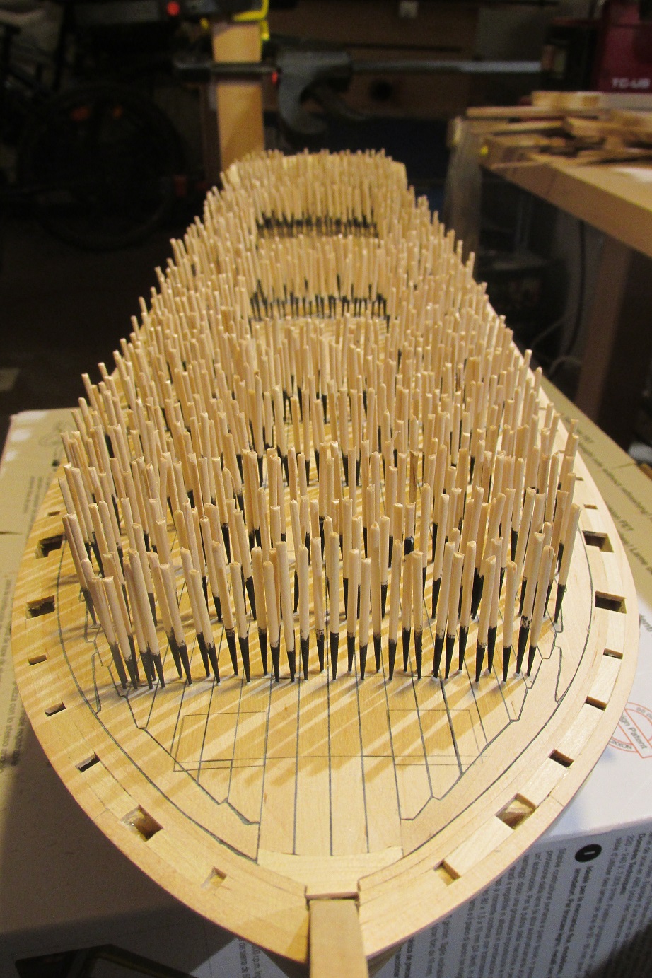 Tak zapalczywie kołkowałem, że złamało mi się wiertło 0,5 mm :-) a ponieważ nie mam zapasowego, to oczywiście zamówiłem i w trakcie czekania zabrałem się za nadbudówkę. Nadbudówka będzie na konstrukcji z listew 5x5 mm. Nie jest to najłatwiejszy sposób, ale żeby się nauczyć trzeba robić i się uczyć :-) Zapraszam do fotek.