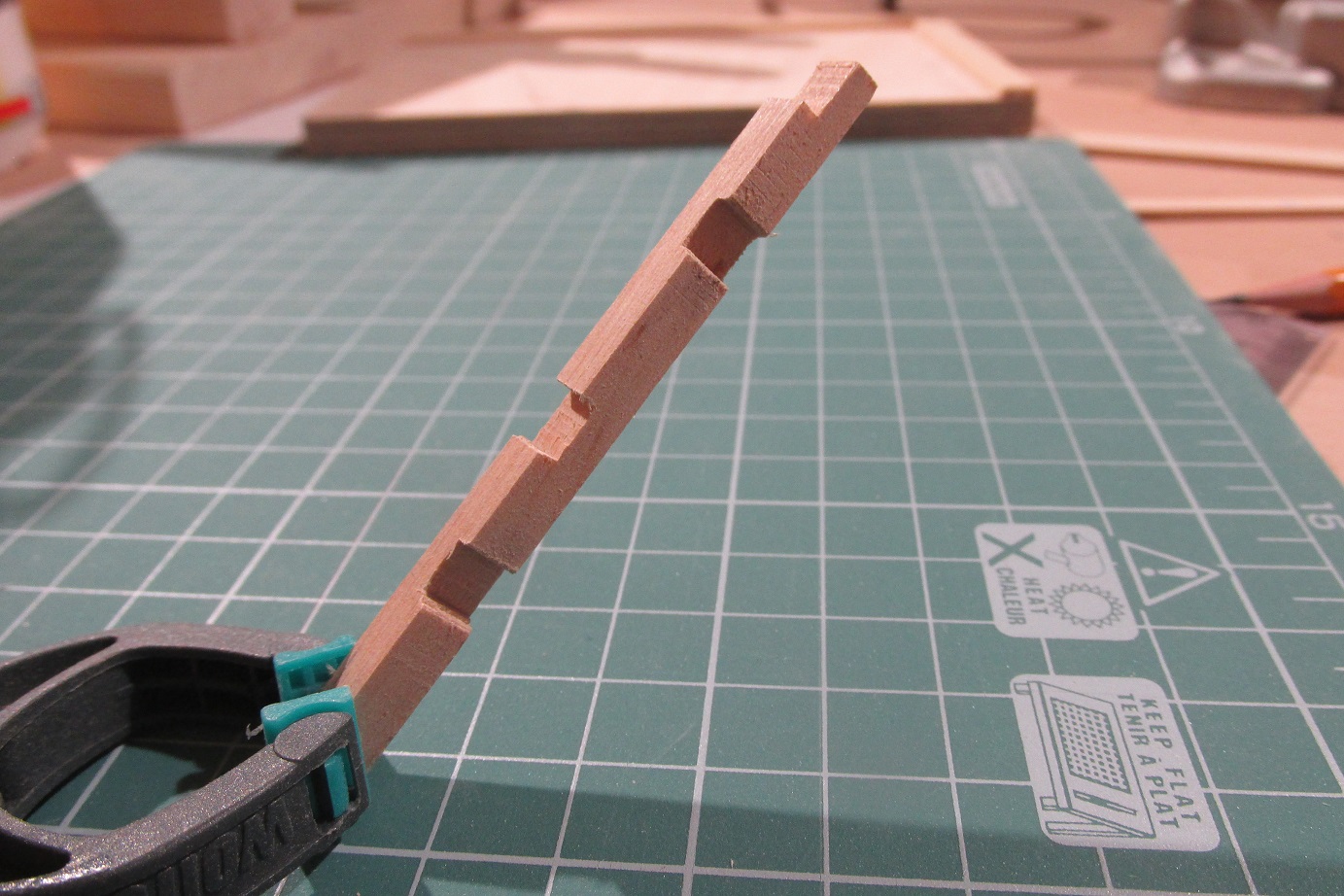 Rozpocząłem jak zwykle od przygotowania materiału i jak zwykle przygotowałem go za mało :-) Narożniki 3x3 mm frezowane na FET-cie i listewki 8x1 mm, wszystko z gruszy.