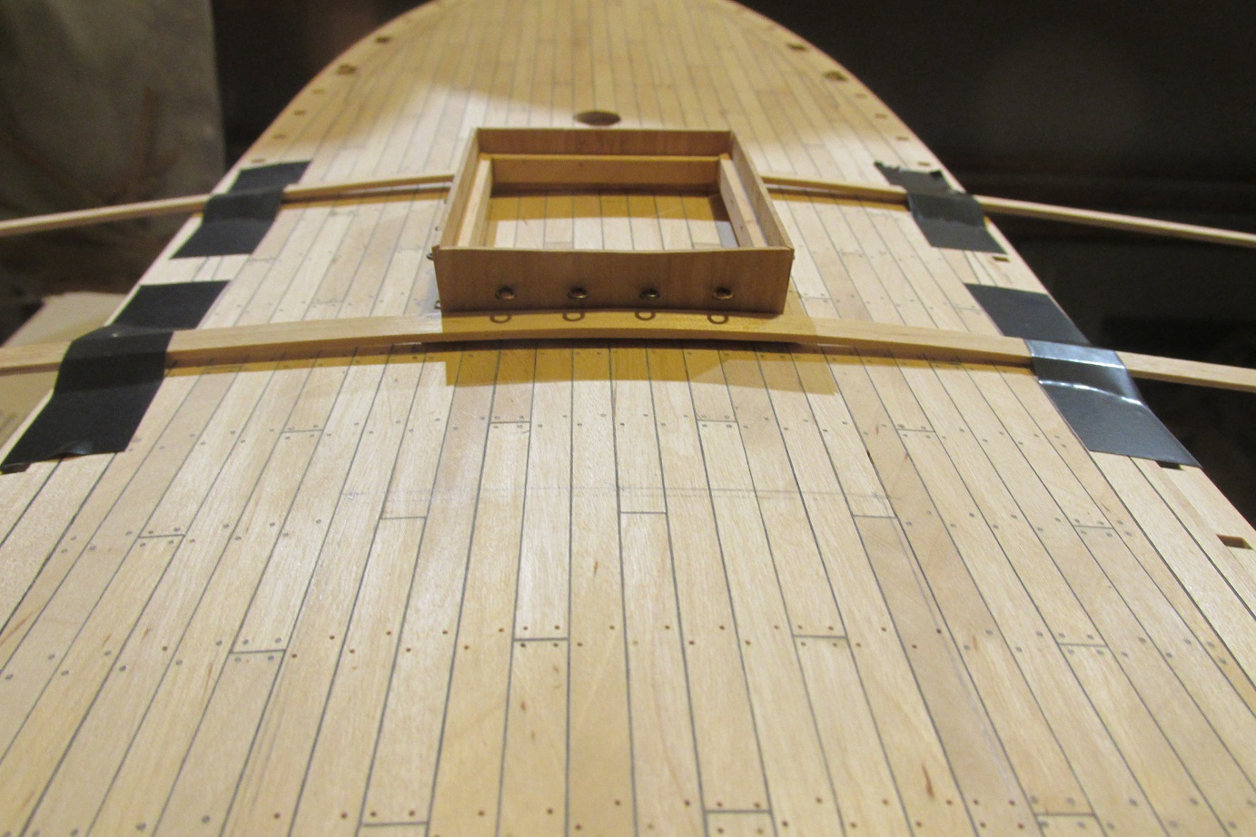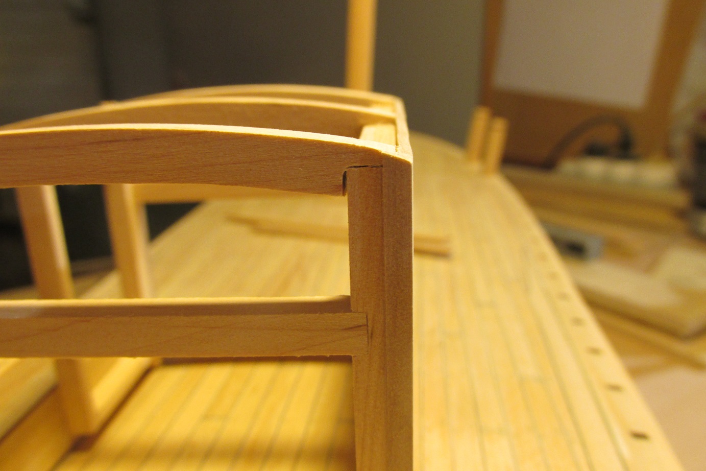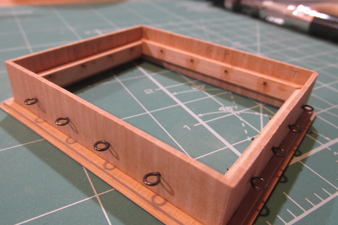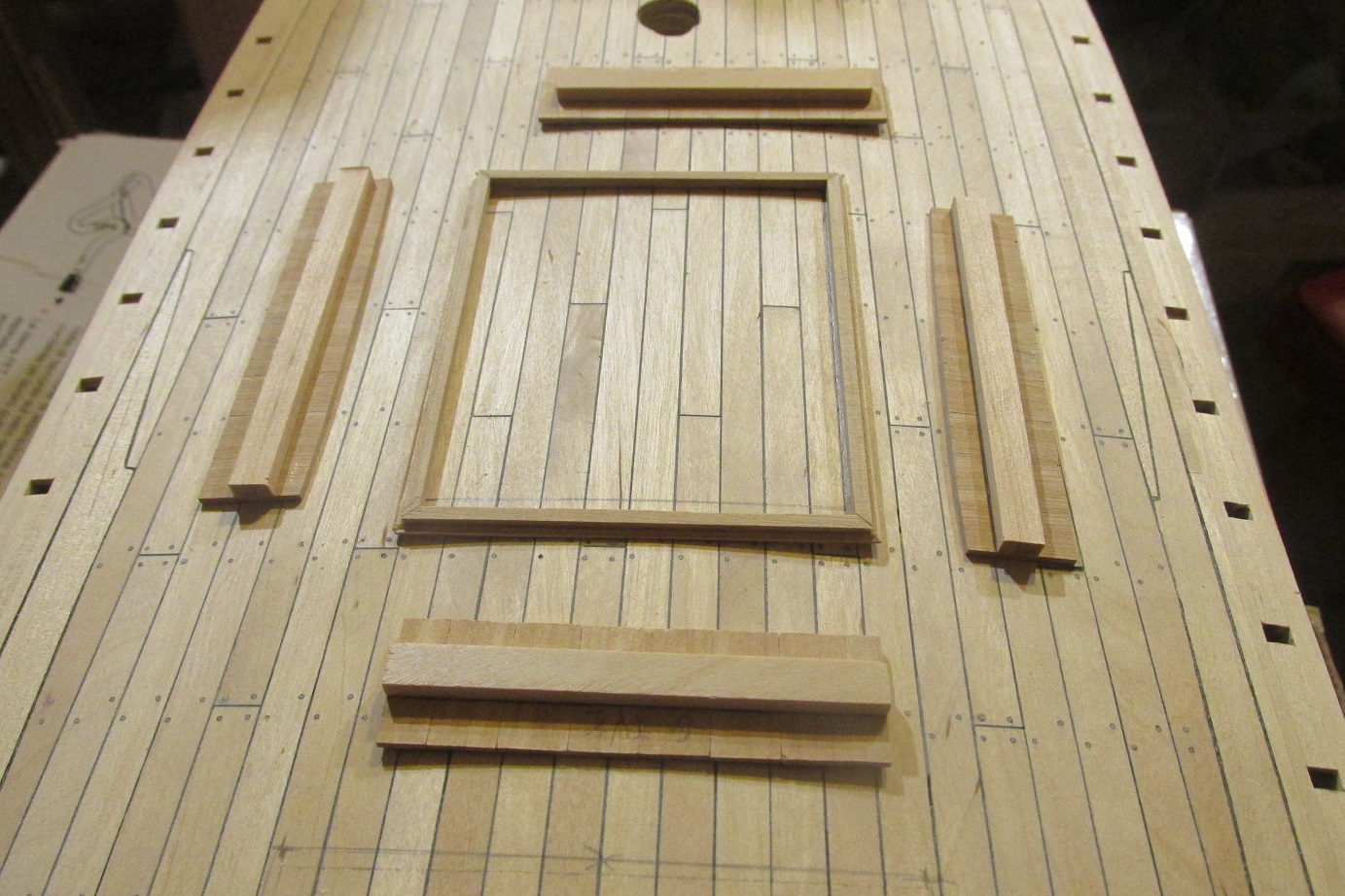 Poszywanie zacząłem od wklejenia narożników i listew poziomych zostawiając miejsce na listwy poziome przy pokładzie.