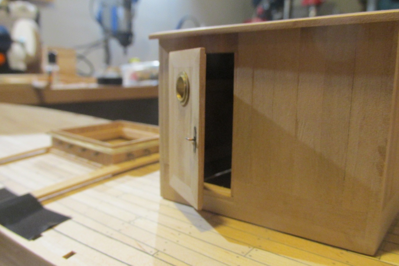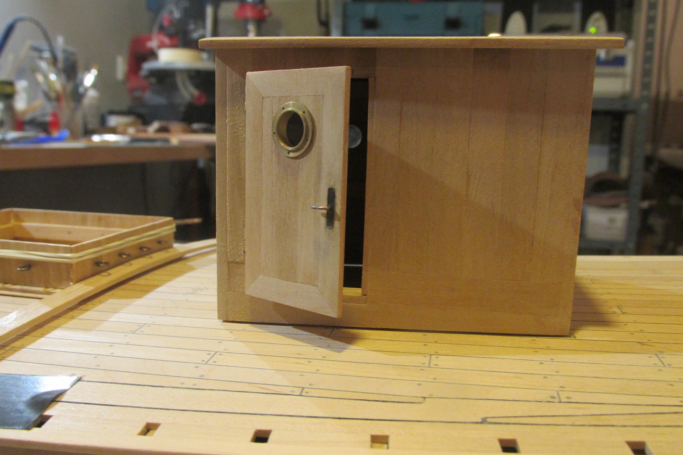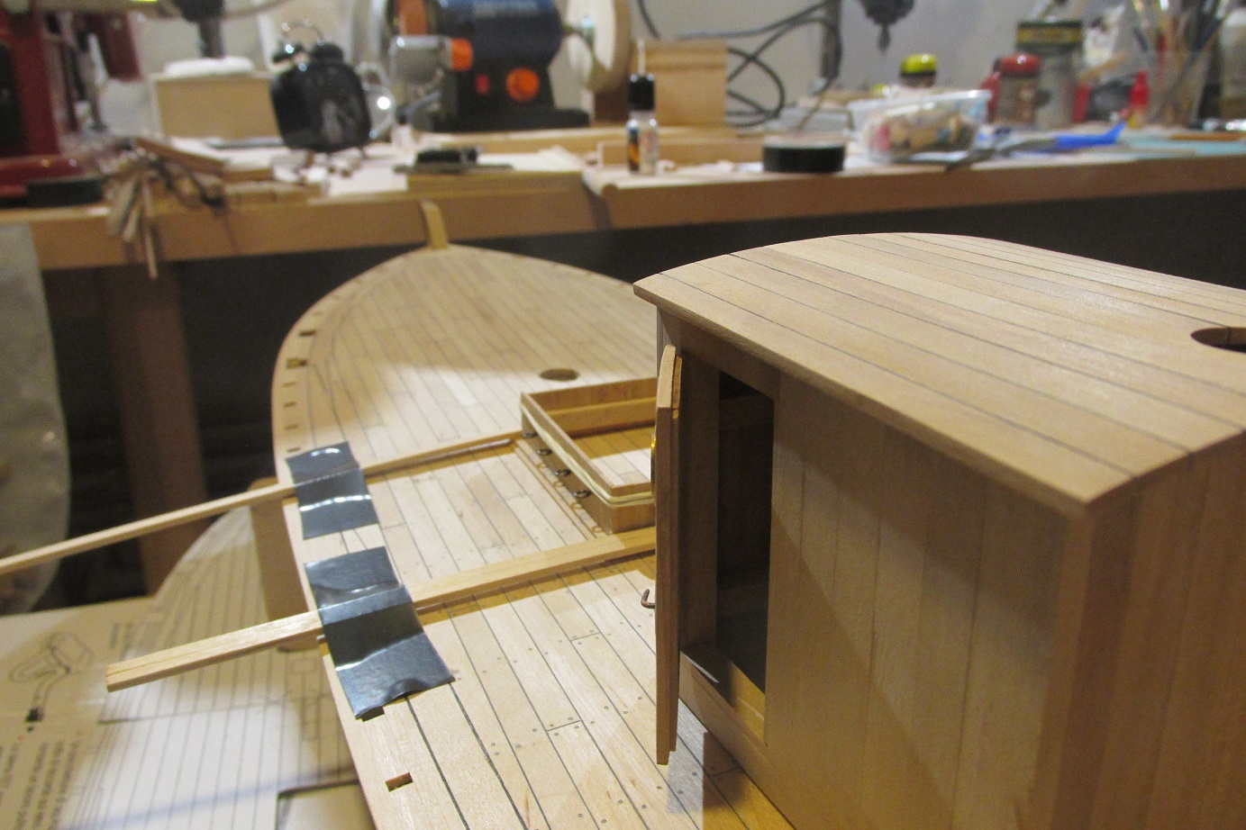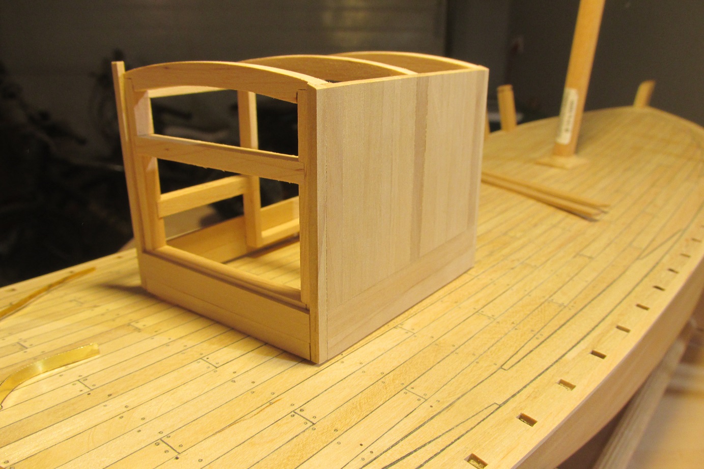 Pracuję cały czas nad nadbudówką oraz walczę z próbami obróbki blachy, ponieważ muszę zrobić zawiasy i okucia do drzwi nadbudówki. Nadbudówka jest poszywana listewkami z gruszy, muszę przyznać, że to drewno znów mnie urzekło :-)