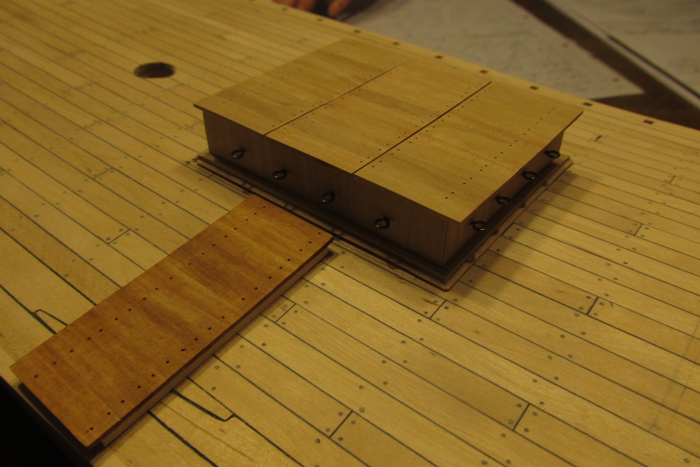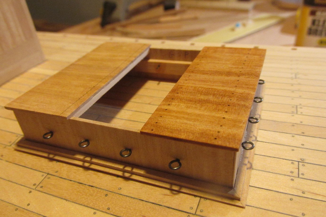 Zakończyłem chyba ładownię :-) Miałem trochę problemów z oczkami i pokrywami górnymi, jedno i drugie wyleciało i zrobiłem na nowo. Oczka były z miedzi i czernienie poszło nie tak jak trzeba, a pokrywy nierówno zacząłem wiercić pod kołki i też musiałem wymienić. Na tych zepsutych zrobiłem test kolorów kaponu i pokostu. Doradźcie proszę co wybrać. Krzysiek w swojej relacji pisał kiedyś, że pokost daje zbyt duży kontrast i wybrał kapon. Miał rację, pokost jest dość ciemny na tle pokładu, ale pięknie wydobywa z gruszy jej niezwykły wygląd. Oczywiście jeśli będzie pokost lub kapon to będę się starał, aby w tym samym kolorze było całe lub większość wyposażenia. Porównanie na pierwszej fotce.