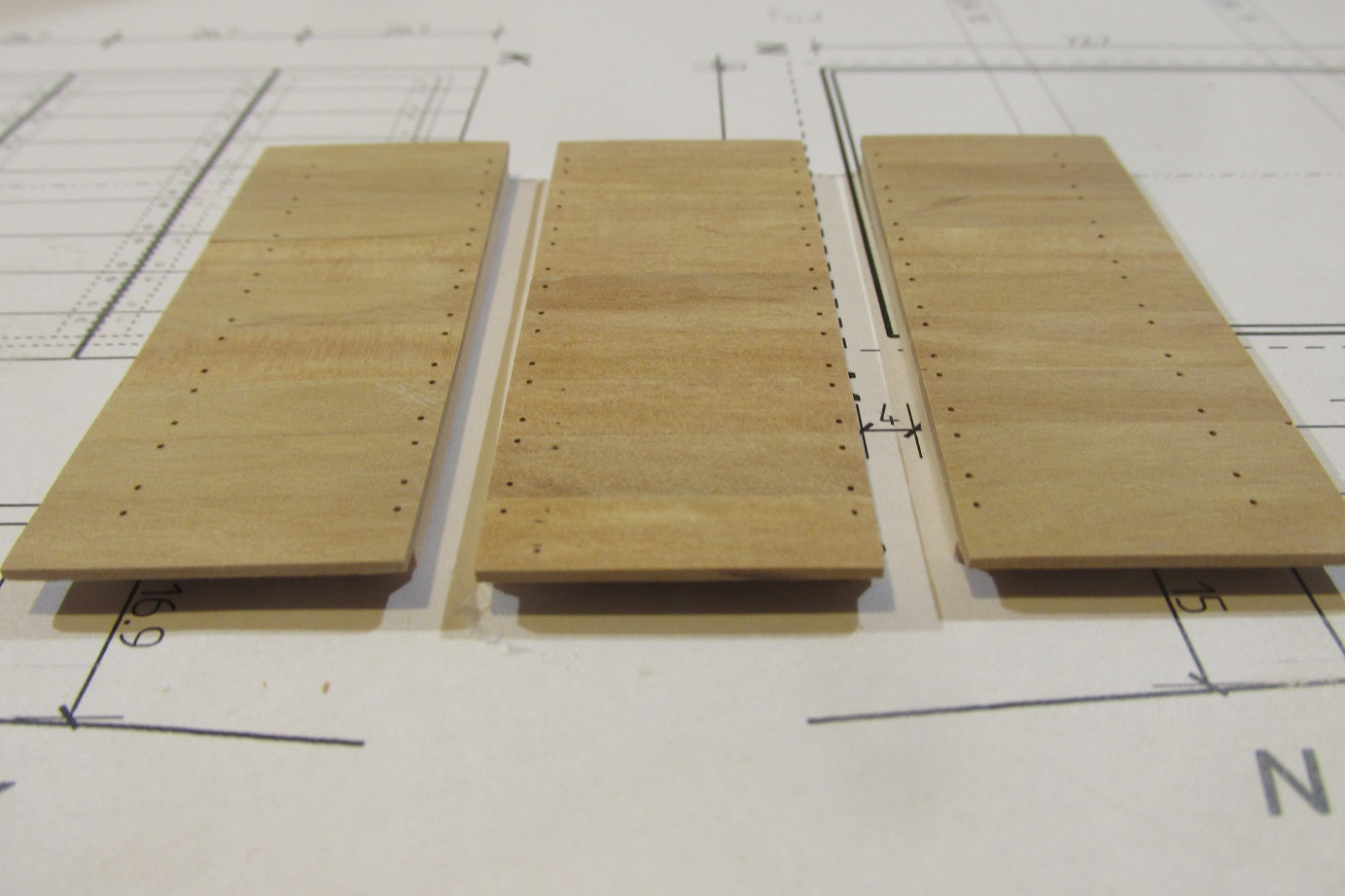 Aby równo wykonać wiercenie pod kołki, zdjąłem z planów ich położenie na taśmę.