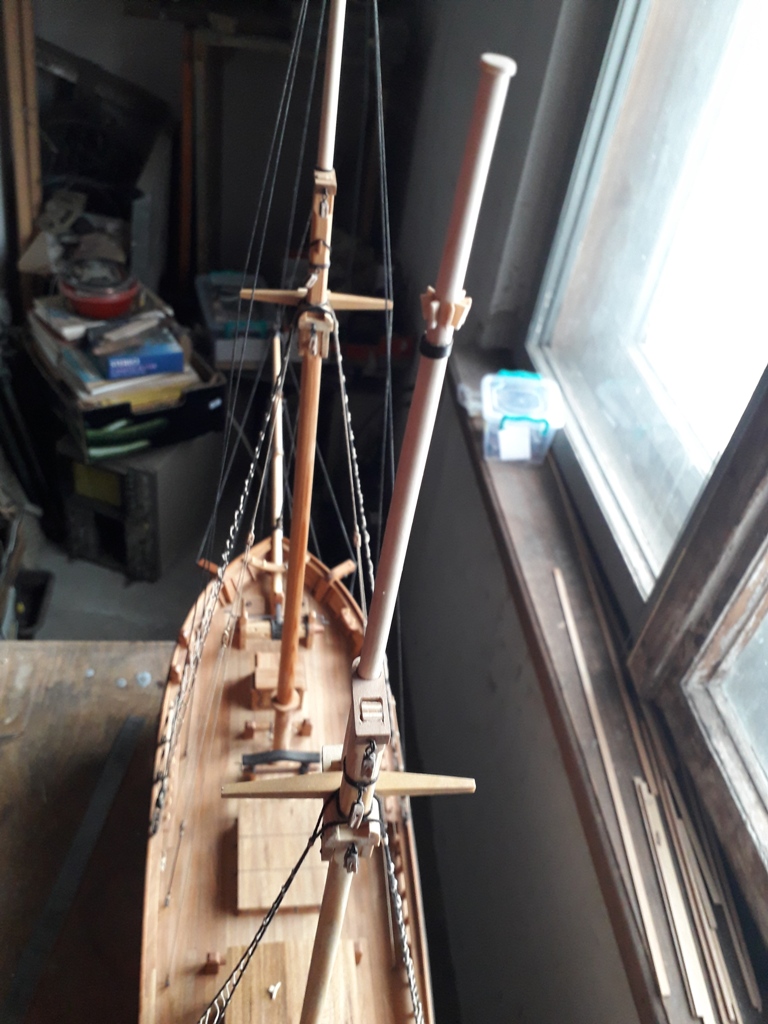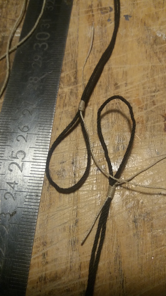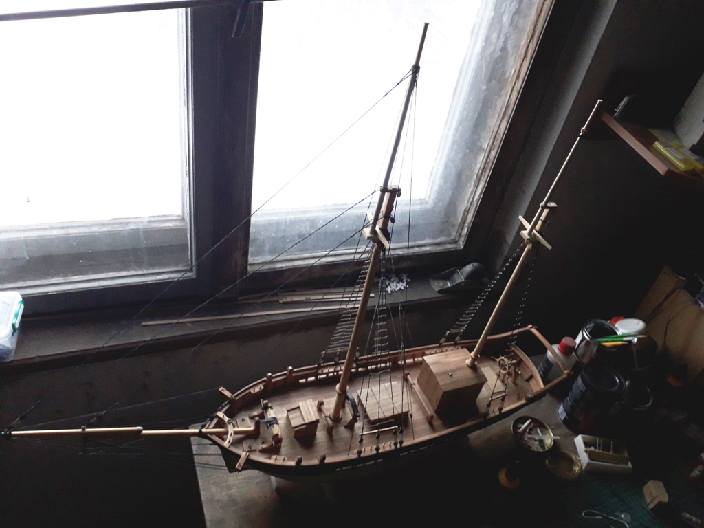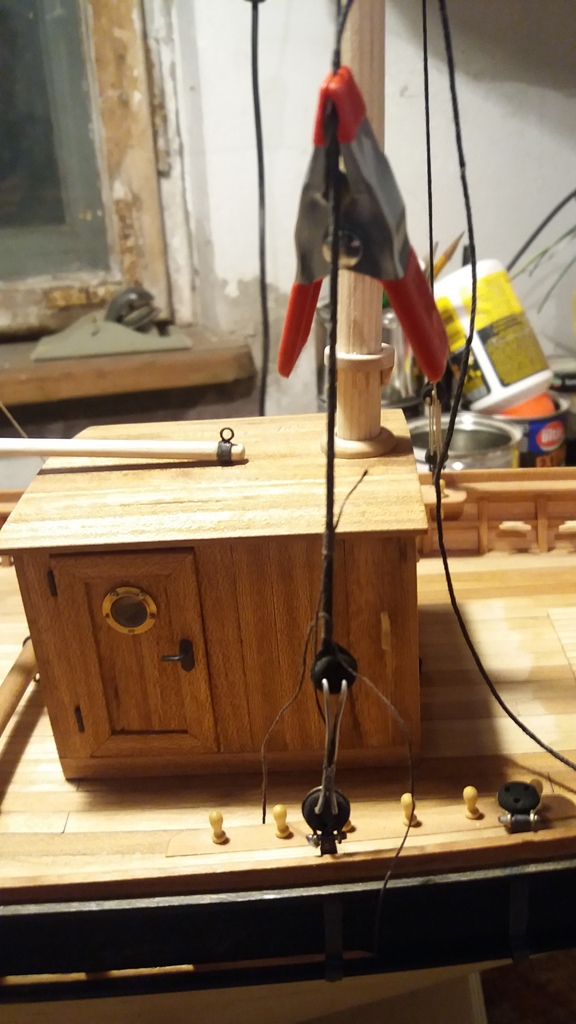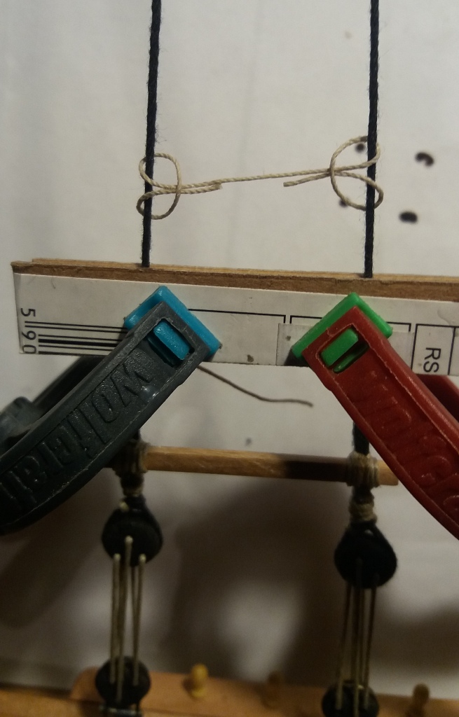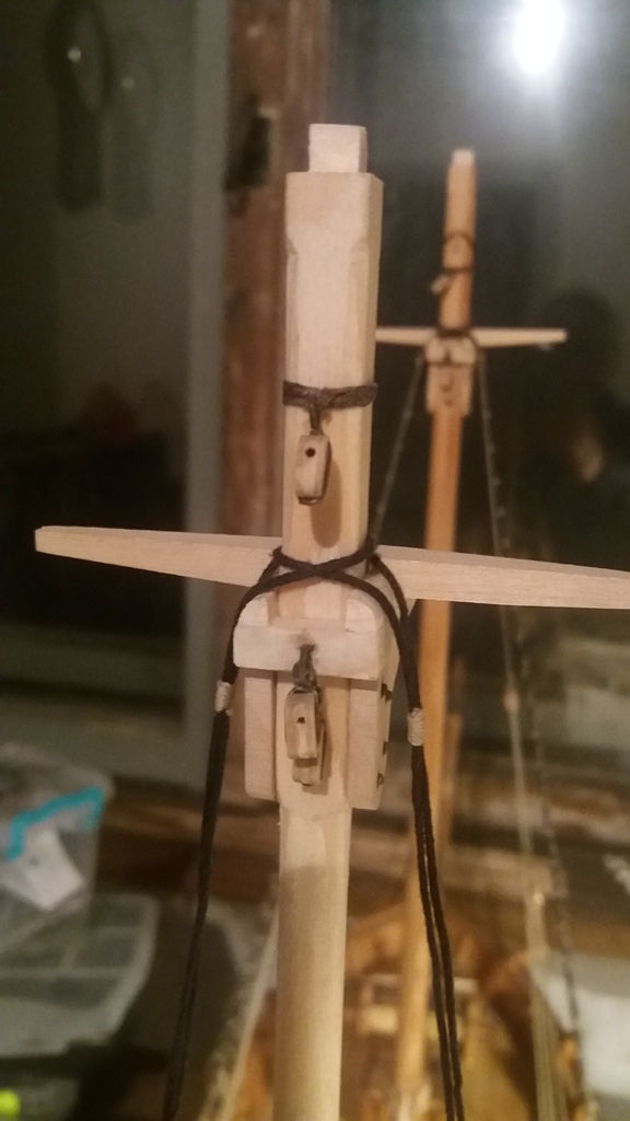 Wiązanie wyblinek ukończone. Obecnie przeniosłem się na grotmaszt i zamocowałem grot stengę.