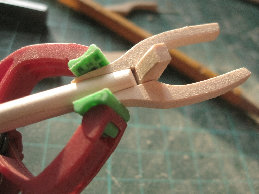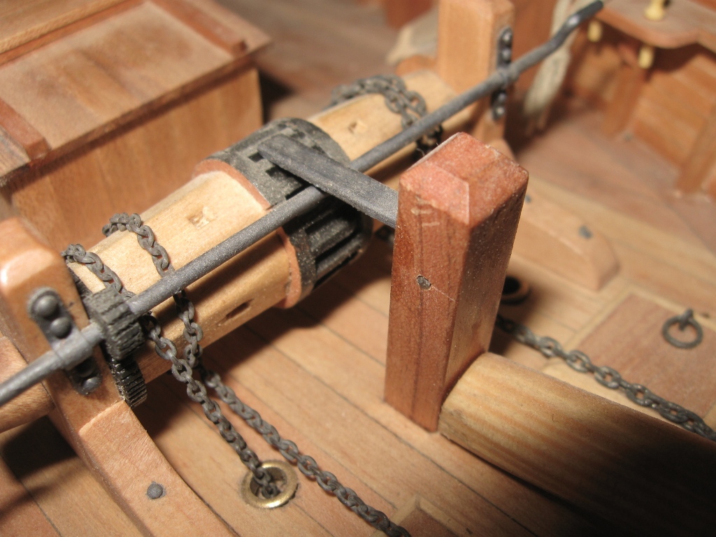 Teraz praca z gaflem bezanmasztu. Poniżej kilka fotografii z tego etapu pracy z modelem. Zmieniłem rodzaj jarzma w stosunko do oryginału z planów Kogi, sugerowałem się zdjęciami dostępnymi w Internecie